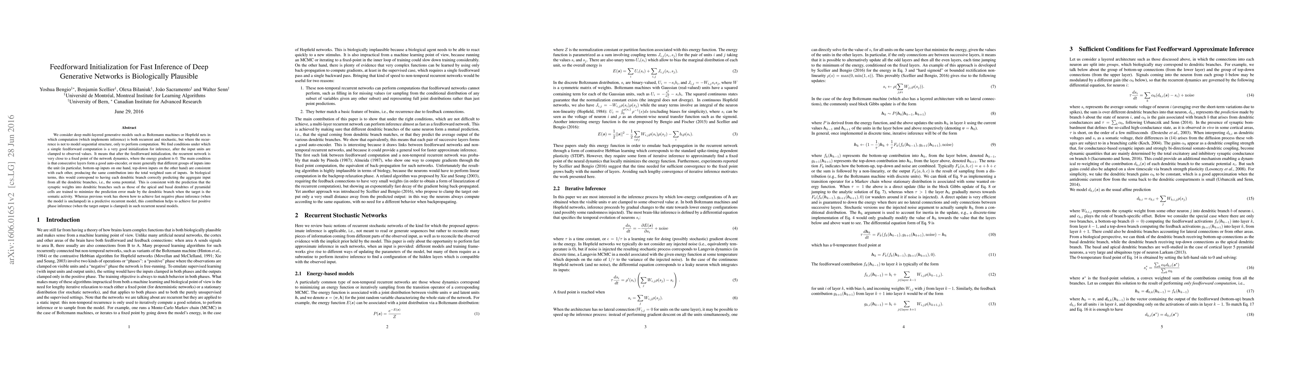 Researchers found that a simple feedforward initialization can lead to fast inference in deep generative networks, especially when the input units are clamped to observed values, under certain conditions such as consistent inputs within each layer.