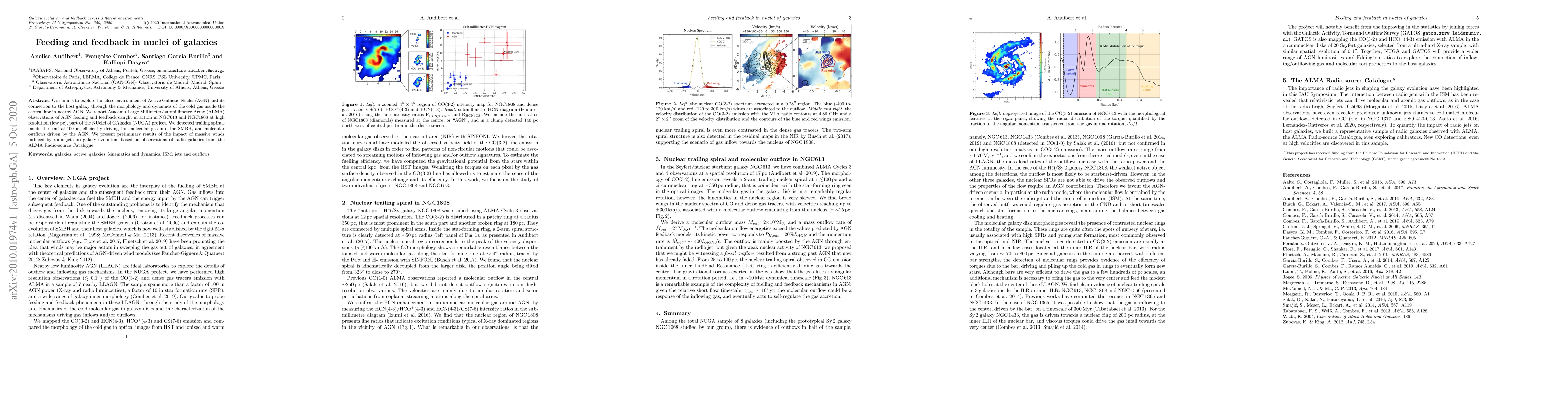 Our aim is to explore the close environment of Active Galactic Nuclei (AGN) and its connection to the host galaxy through the morphology and dynamics of the cold gas inside the central kpc in nearby AGN. We report Atacama Large Millimeter/submillimeter Array (ALMA) observations of AGN feeding and feedback caught in action in NGC613 and NGC1808 at high resolution (few pc), part of the NUclei of GAlaxies (NUGA) project. We detected trailing spirals inside the central 100pc, efficiently driving the molecular gas into the SMBH, and molecular outflows driven by the AGN. We present preliminary results of the impact of massive winds induced by radio jets on galaxy evolution, based on observations of radio galaxies from the ALMA Radio-source Catalogue.