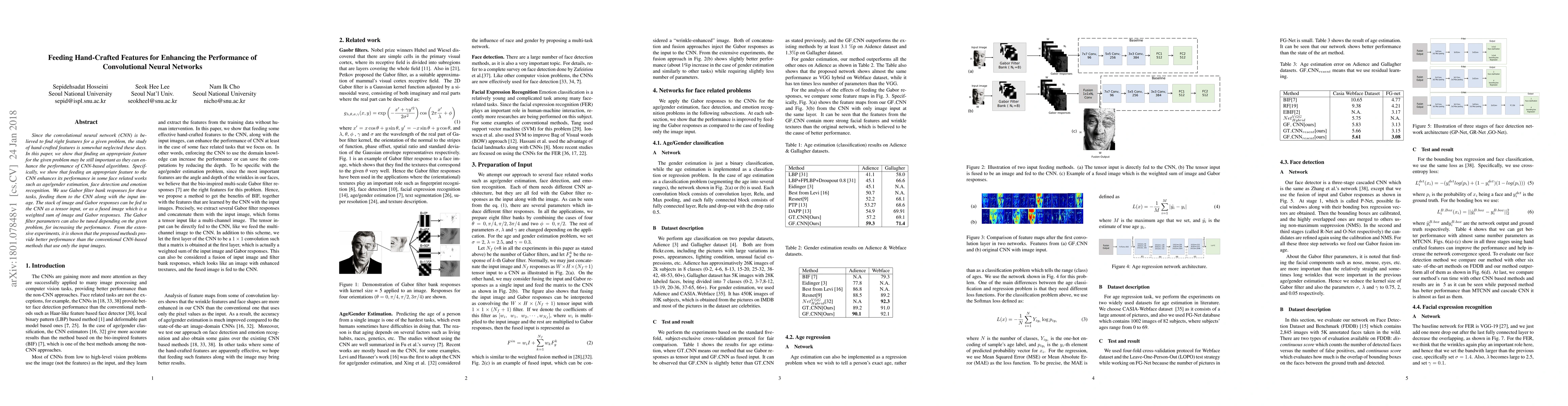 Since the convolutional neural network (CNN) is be- lieved to find right features for a given problem, the study of hand-crafted features is somewhat neglected these days. In this paper, we show that finding an appropriate feature for the given problem may be still important as they can en- hance the performance of CNN-based algorithms. Specif- ically, we show that feeding an appropriate feature to the CNN enhances its performance in some face related works such as age/gender estimation, face detection and emotion recognition. We use Gabor filter bank responses for these tasks, feeding them to the CNN along with the input image. The stack of image and Gabor responses can be fed to the CNN as a tensor input, or as a fused image which is a weighted sum of image and Gabor responses. The Gabor filter parameters can also be tuned depending on the given problem, for increasing the performance. From the extensive experiments, it is shown that the proposed methods provide better performance than the conventional CNN-based methods that use only the input images.
