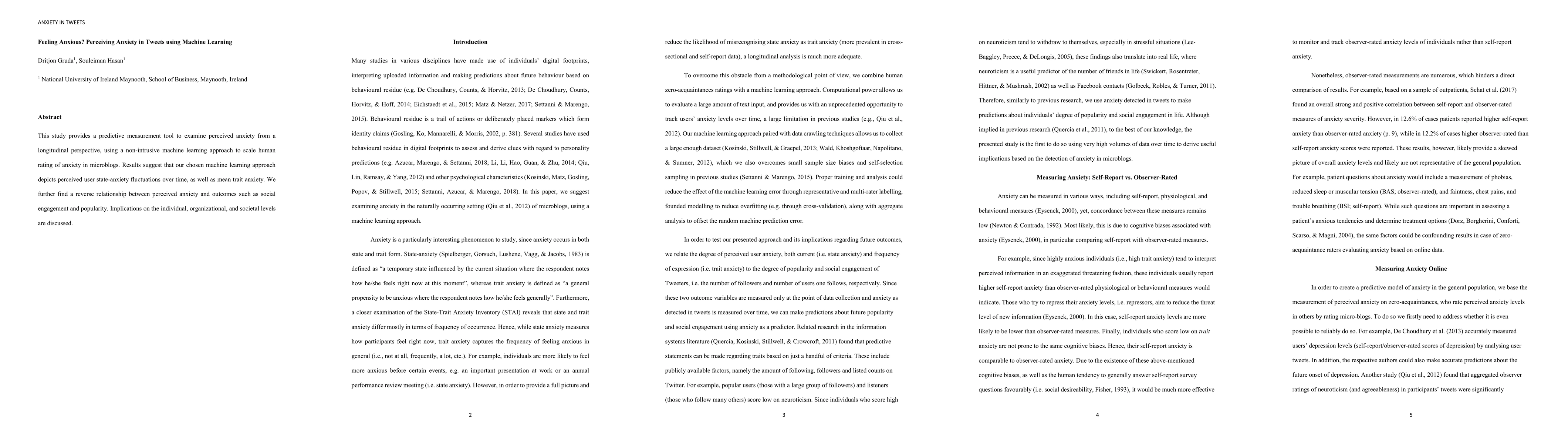 This study provides a predictive measurement tool to examine perceived anxiety from a longitudinal perspective, using a non-intrusive machine learning approach to scale human rating of anxiety in microblogs. Results suggest that our chosen machine learning approach depicts perceived user state-anxiety fluctuations over time, as well as mean trait anxiety. We further find a reverse relationship between perceived anxiety and outcomes such as social engagement and popularity. Implications on the individual, organizational, and societal levels are discussed.
