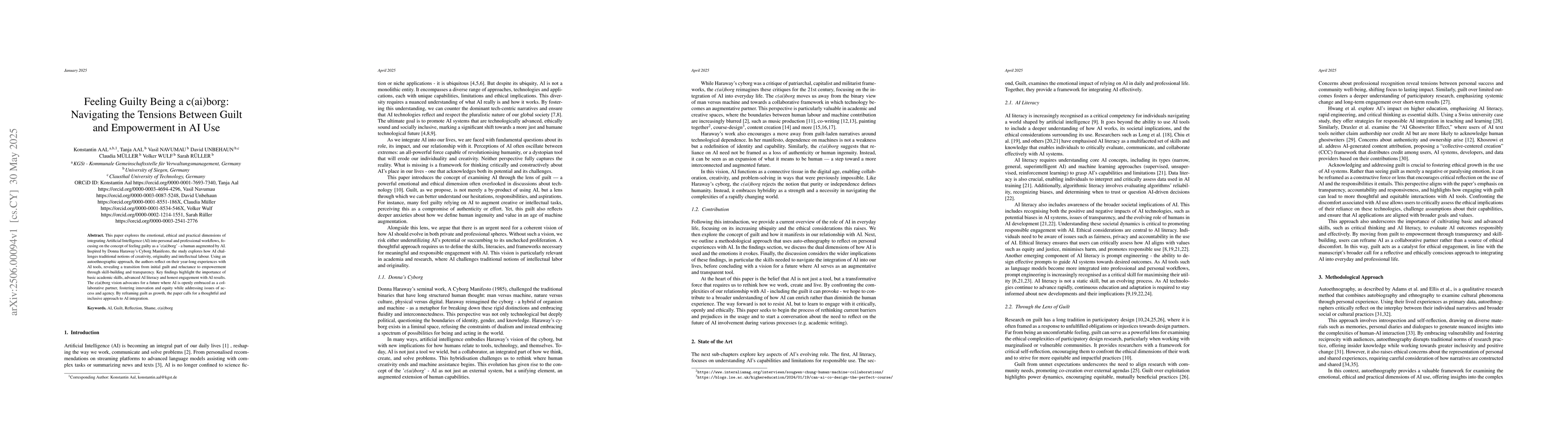 This paper explores the emotional, ethical and practical dimensions of integrating Artificial Intelligence (AI) into personal and professional workflows, focusing on the concept of feeling guilty as a 'c(ai)borg' - a human augmented by AI. Inspired by Donna Haraway's Cyborg Manifesto, the study explores how AI challenges traditional notions of creativity, originality and intellectual labour. Using an autoethnographic approach, the authors reflect on their year-long experiences with AI tools, revealing a transition from initial guilt and reluctance to empowerment through skill-building and transparency. Key findings highlight the importance of basic academic skills, advanced AI literacy and honest engagement with AI results. The c(ai)borg vision advocates for a future where AI is openly embraced as a collaborative partner, fostering innovation and equity while addressing issues of access and agency. By reframing guilt as growth, the paper calls for a thoughtful and inclusive approach to AI integration.