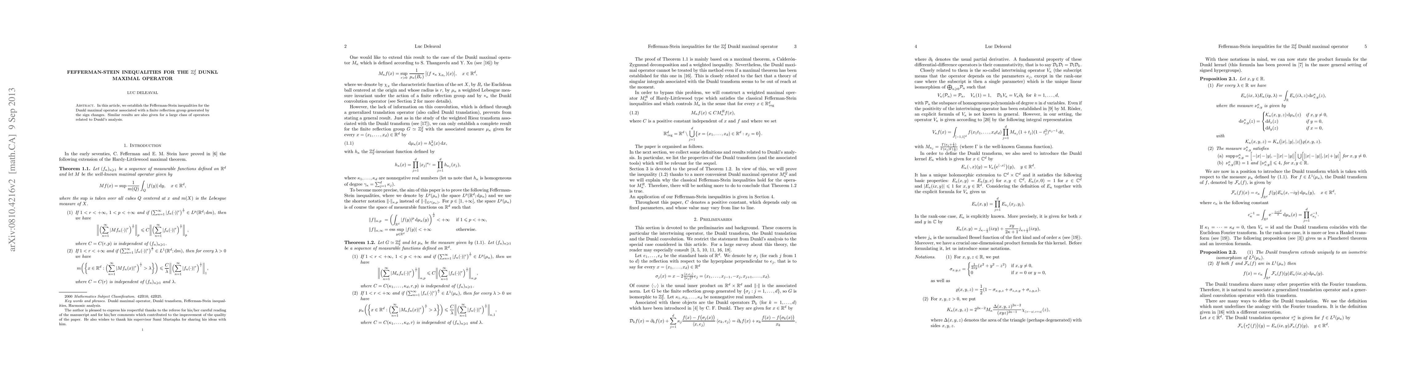 In this article, we establish the Fefferman-Stein inequalities for the Dunkl maximal operator associated with a finite reflection group generated by the sign changes. Similar results are also given for a large class of operators related to Dunkl's analysis.