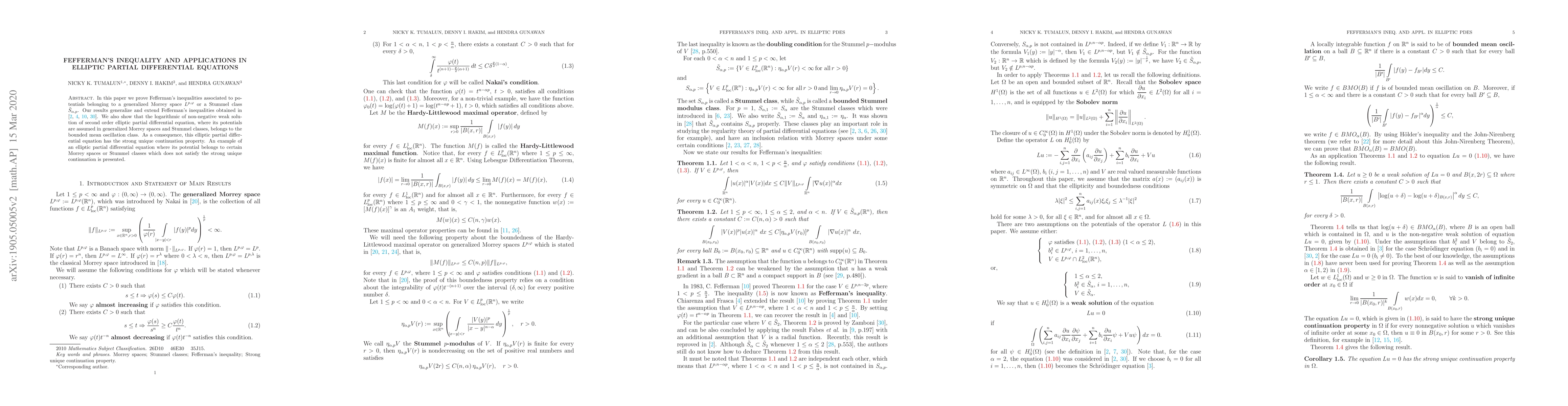 This paper proves Fefferman's inequalities for potentials in generalized Morrey and Stummel classes, extending previous results. It demonstrates that weak solutions to certain elliptic partial differential equations with these potentials belong to the bounded mean oscillation class, leading to the strong unique continuation property. An example is provided where the potential does not satisfy this property.