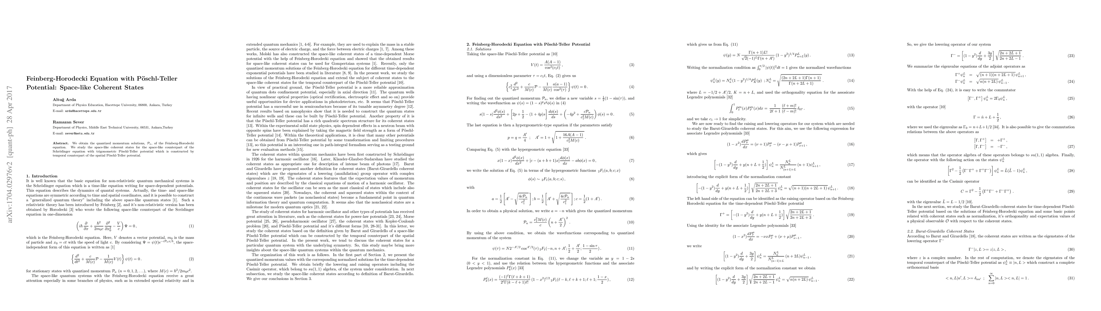 This paper quantizes the momentum solutions of the Feinberg-Horodecki equation and investigates space-like coherent states for a modified Schrödinger equation featuring a trigonometric Pöschl-Teller potential derived from its spatial counterpart.