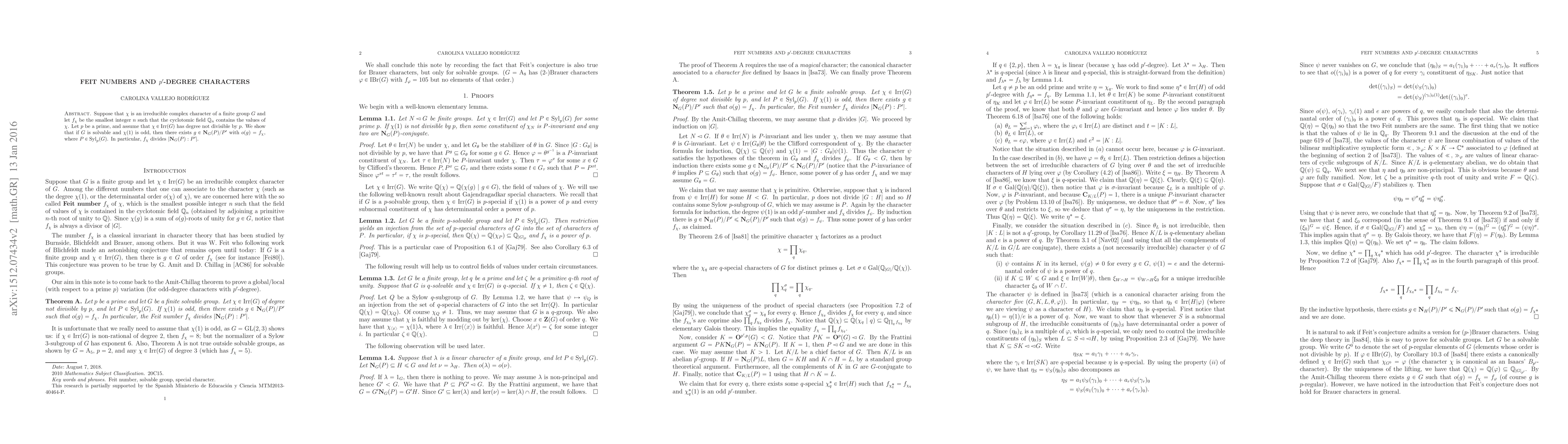Suppose that $\chi$ is an irreducible complex character of $G$ and let $f_\chi$ be the smallest integer $n$ such that the cyclotomic field $\mathbb Q_n$ contains the values of $\chi$. Let $p$ be a prime, and assume that $\chi \in \textrm{Irr}(G)$ has degree not divisible by $p$. If $G$ is solvable and $\chi(1)$ is odd, then there exists $g \in {\bf N}_G(P) /P'$ with $o(g)=f_\chi$. In particular $f_\chi$ divides $|{\bf N}_G(P) /P'|$.