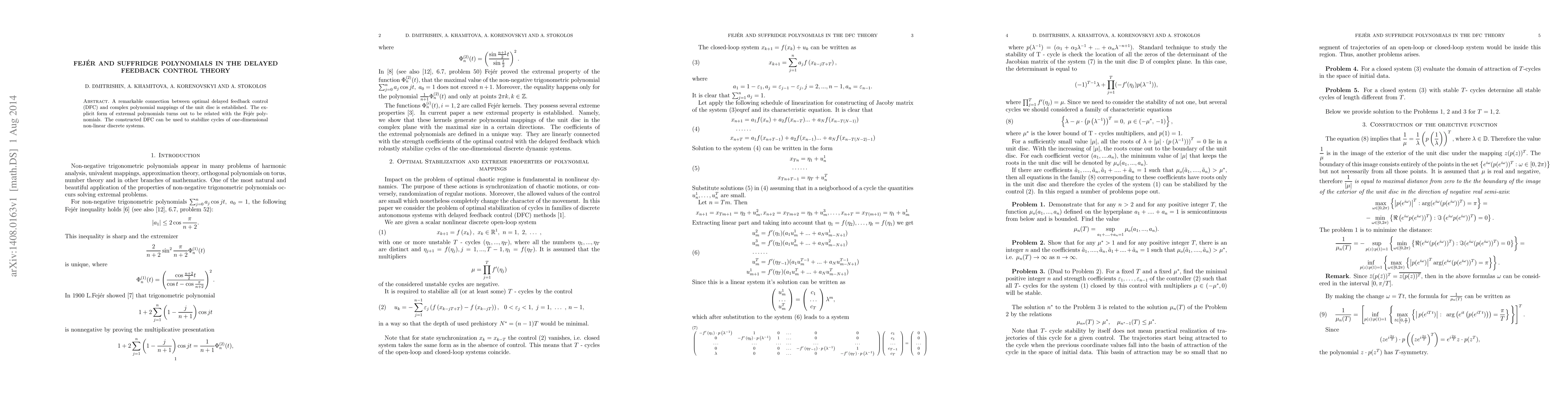 A remarkable connection between optimal delayed feedback control (DFC) and complex polynomial mappings of the unit disc is established. The explicit form of extremal polynomials turns out to be related with the Fejer polynomials. The constructed DFC can be used to stabilize cycles of one-dimensional non-linear discrete systems.