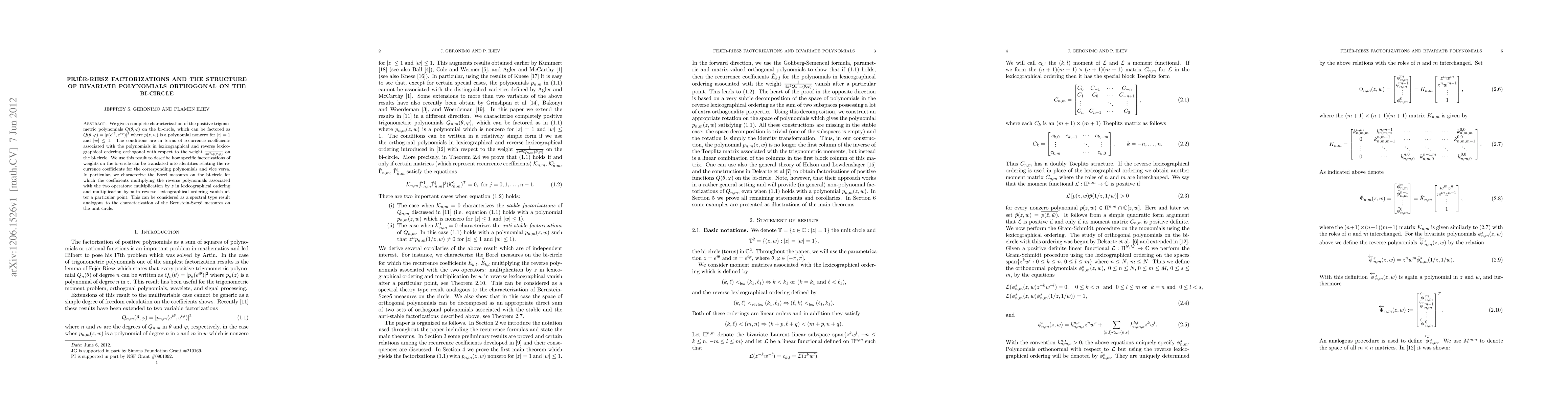 We give a complete characterization of the positive trigonometric polynomials Q(\theta,\phi) on the bi-circle, which can be factored as Q(\theta,\phi)=|p(e^{i\theta},e^{i\phi})|^2 where p(z,w) is a polynomial nonzero for |z|=1 and |w|\leq 1. The conditions are in terms of recurrence coefficients associated with the polynomials in lexicographical and reverse lexicographical ordering orthogonal with respect to the weight 1/(4\pi^2Q(\theta,\phi)) on the bi-circle. We use this result to describe how specific factorizations of weights on the bi-circle can be translated into identities relating the recurrence coefficients for the corresponding polynomials and vice versa. In particular, we characterize the Borel measures on the bi-circle for which the coefficients multiplying the reverse polynomials associated with the two operators: multiplication by z in lexicographical ordering and multiplication by w in reverse lexicographical ordering vanish after a particular point. This can be considered as a spectral type result analogous to the characterization of the Bernstein-Szeg\H{o} measures on the unit circle.