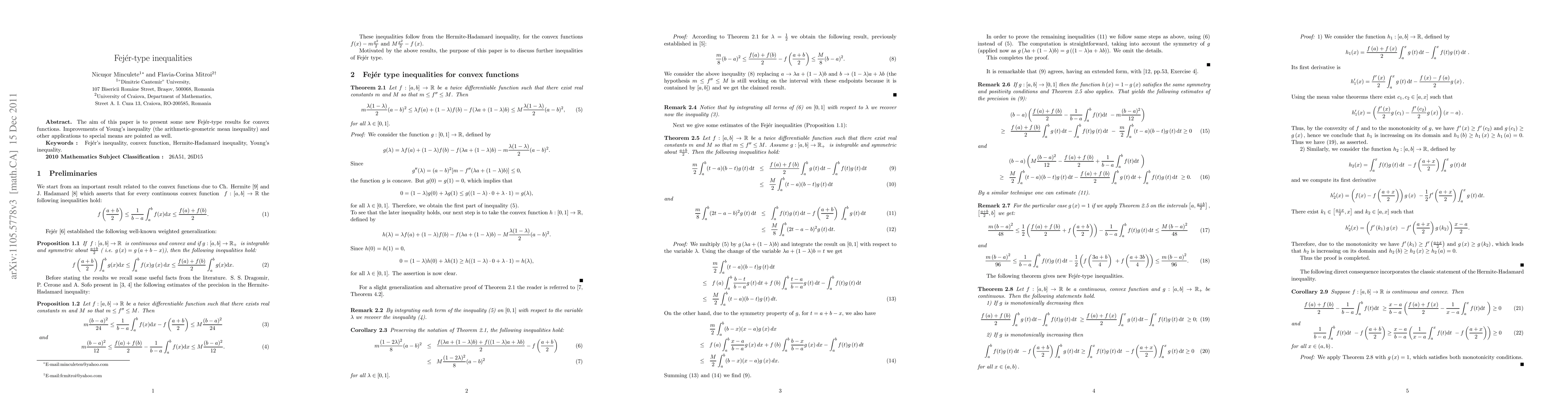The aim of this paper is to present some new Fejer-type results for convex functions. Improvements of Young's inequality (the arithmetic-geometric mean inequality) and other applications to special means are pointed as well.