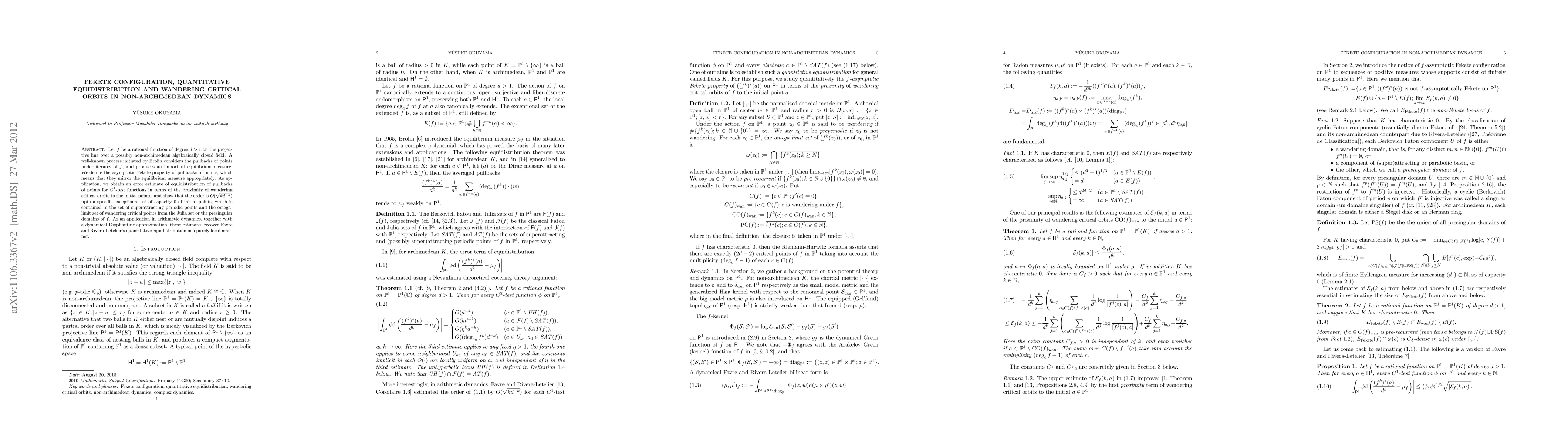 This paper studies rational functions in non-archimedean dynamics, defining the asymptotic Fekete property for pullbacks of points and deriving an error estimate for equidistribution of these points. The results show that the equidistribution error is $O(\sqrt{kd^{-k}})$, influenced by the proximity of wandering critical orbits, and apply to recover quantitative equidistribution results in arithmetic dynamics.