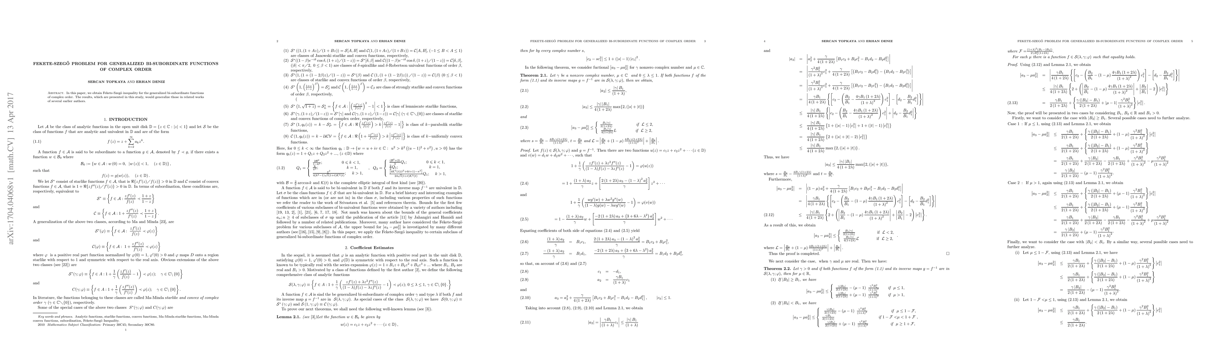 In this paper, we obtain Fekete-Szeg\"o inequality for the generalized bi-subordinate functions of complex order. The results, which are presented in this study, would generalize those in related works of several earlier authors.