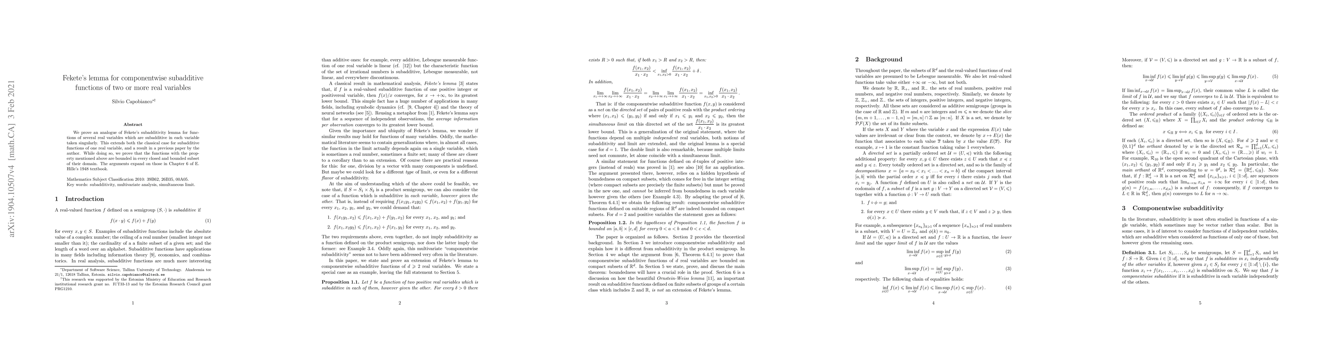 This paper proves an extension of Fekete's subadditivity lemma for componentwise subadditive functions of two or more real variables, showing they are bounded in closed and bounded subsets, and follows arguments from E. Hille's 1948 textbook.
