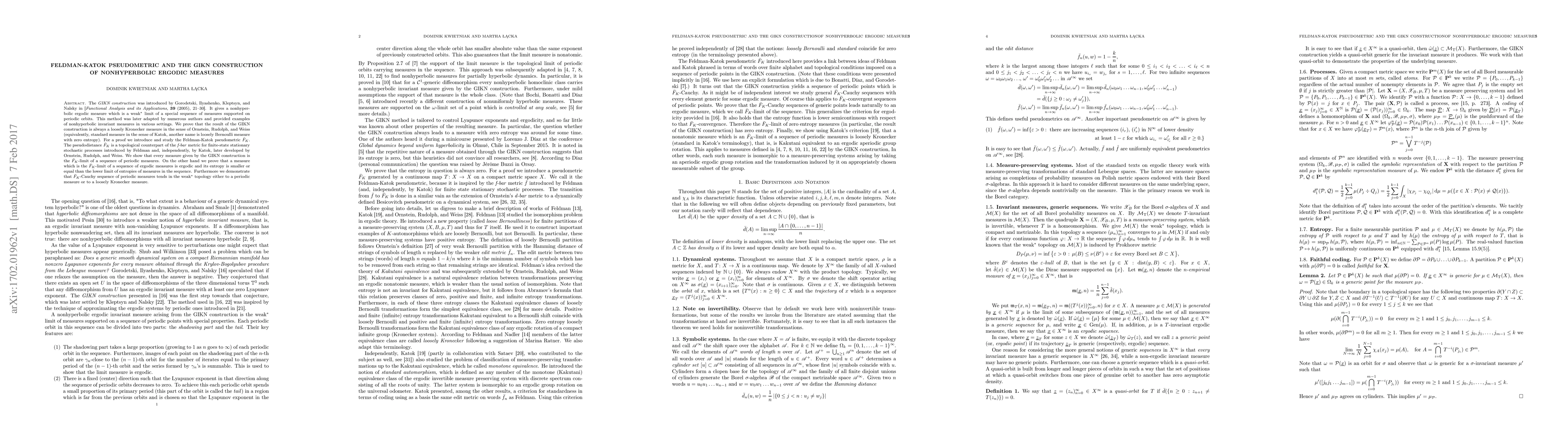 The GIKN construction yields nonhyperbolic ergodic measures, which are shown to be loosely Kronecker measures using the Feldman-Katok pseudometric $\bar{F_{K}}$. This pseudometric demonstrates that GIKN measures are the $\bar{F_{K}}$-limit of periodic measures, and it also establishes properties of entropy and weak$^*$ convergence for such sequences.