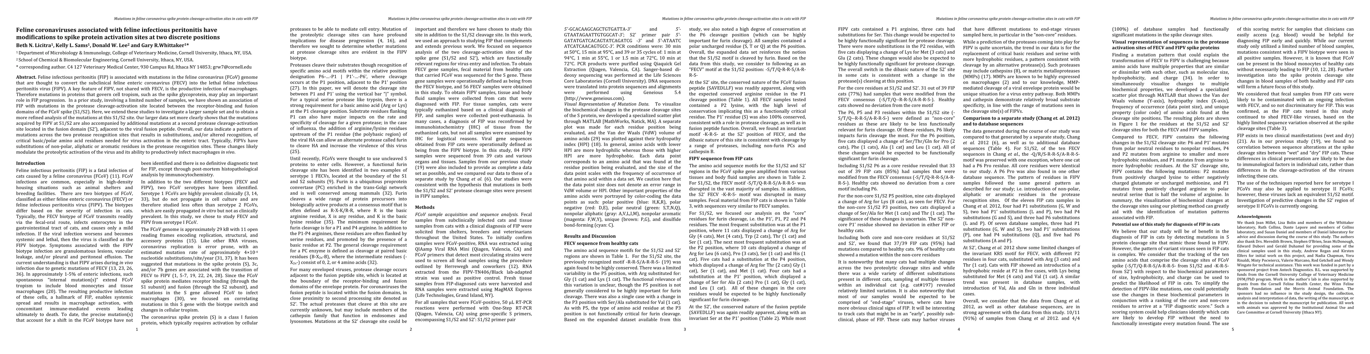 Feline infectious peritonitis (FIP) is associated with mutations in the feline coronavirus (FCoV) genome that are thought to convert the subclinical feline enteric coronavirus (FECV) into the lethal feline infectious peritonitis virus (FIPV). A key feature of FIPV, not shared with FECV, is the productive infection of macrophages. Therefore mutations in proteins that govern cell tropism, such as the spike glycoprotein, may play an important role in FIP progression. In a prior study, involving a limited number of samples, we have shown an association of FIP with mutations in the protease cleavage-activation site located between the receptor-binding and fusion domains of the FCoV spike (S1/S2). Here, we extend these studies to investigate a larger sample set and to obtain a more refined analysis of the mutations at this S1/S2 site. Our larger data set more clearly shows that the mutations acquired by FIPV at S1/S2 are also accompanied by additional mutations at a second protease cleavage-activation site located in the fusion domain (S2'), adjacent to the viral fusion peptide. Overall, our data indicate a pattern of mutations across the two protease recognition sites that results in substitutions, and/or altered recognition, of critical basic/polar amino acid residues needed for virus activation in the enteric tract. Typically, FIPVs have substitutions of non-polar, aliphatic or aromatic residues in the protease recognition sites. These changes likely modulate the proteolytic activation of the virus and its ability to productively infect macrophages in vivo.
