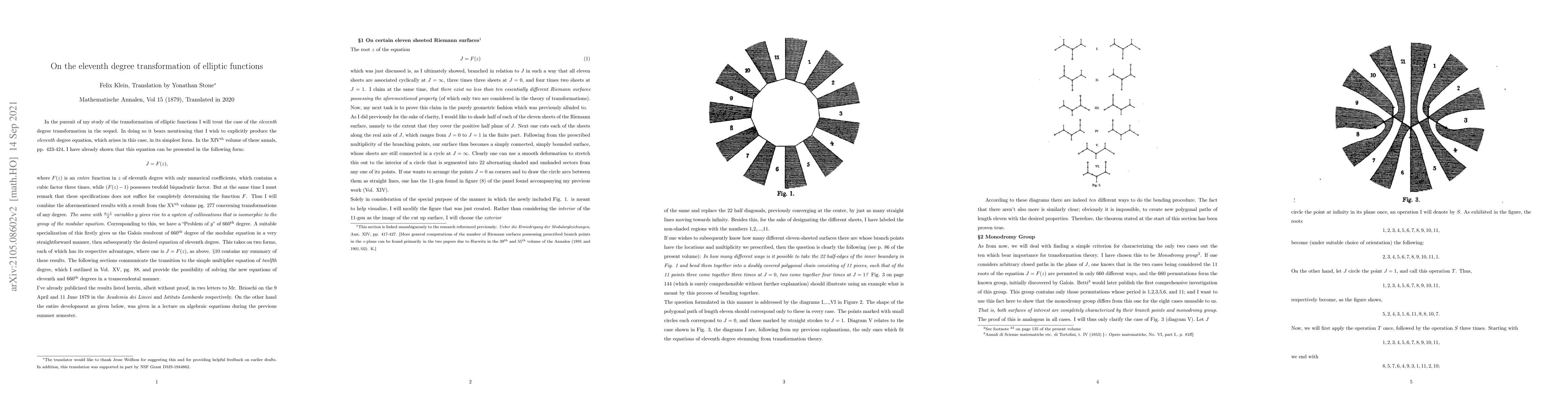 Felix Klein's 1879 paper explores transformations of elliptic functions, introducing the concept of a transformation of order 11 for these functions. He provides mathematical frameworks to study these transformations, contributing significantly to the field of number theory.
