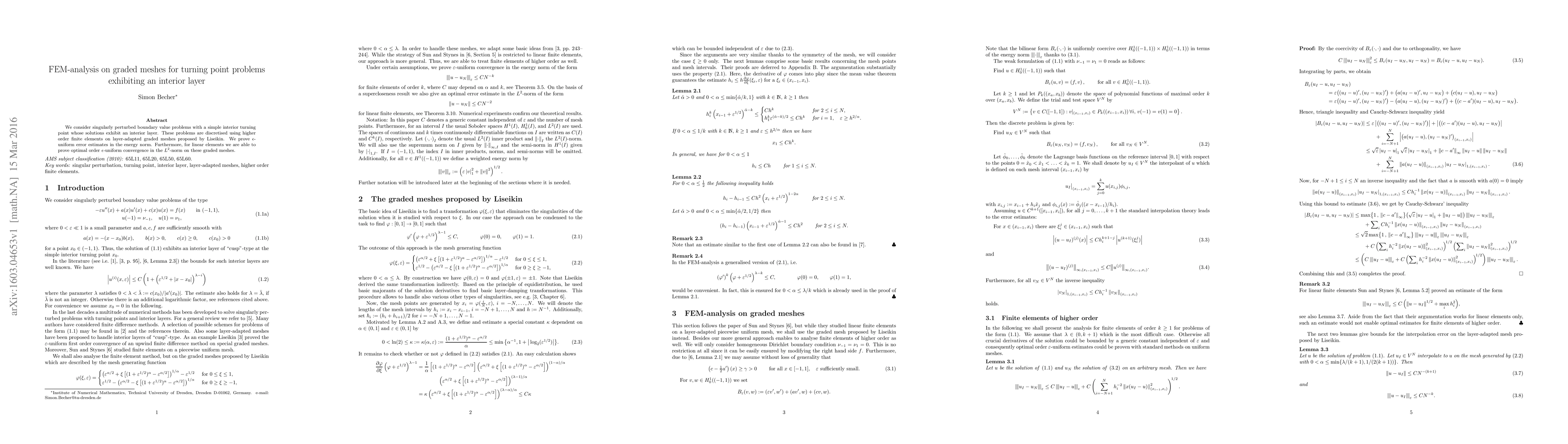 We consider singularly perturbed boundary value problems with a simple interior turning point whose solutions exhibit an interior layer. These problems are discretised using higher order finite elements on layer-adapted graded meshes proposed by Liseikin. We prove $\epsilon$-uniform error estimates in the energy norm. Furthermore, for linear elements we are able to prove optimal order $\epsilon$-uniform convergence in the $L^2$-norm on these graded meshes.
