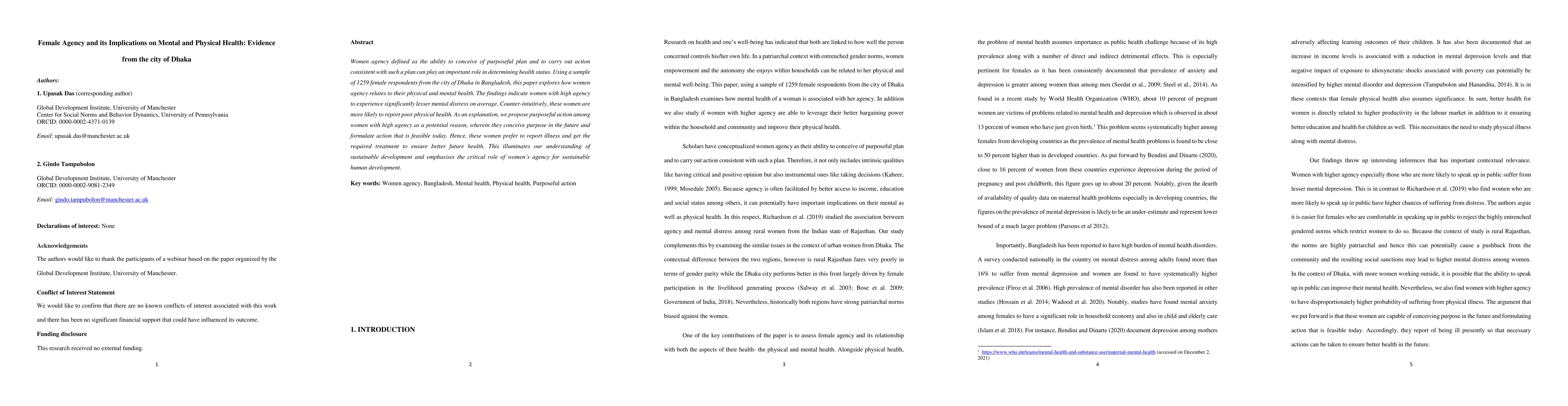 This study examines the relationship between female agency and health in Dhaka, Bangladesh, finding that higher agency correlates with less mental distress but paradoxically more reported physical health issues. The authors suggest that women with high agency may prioritize future health, leading to more illness reporting and treatment.