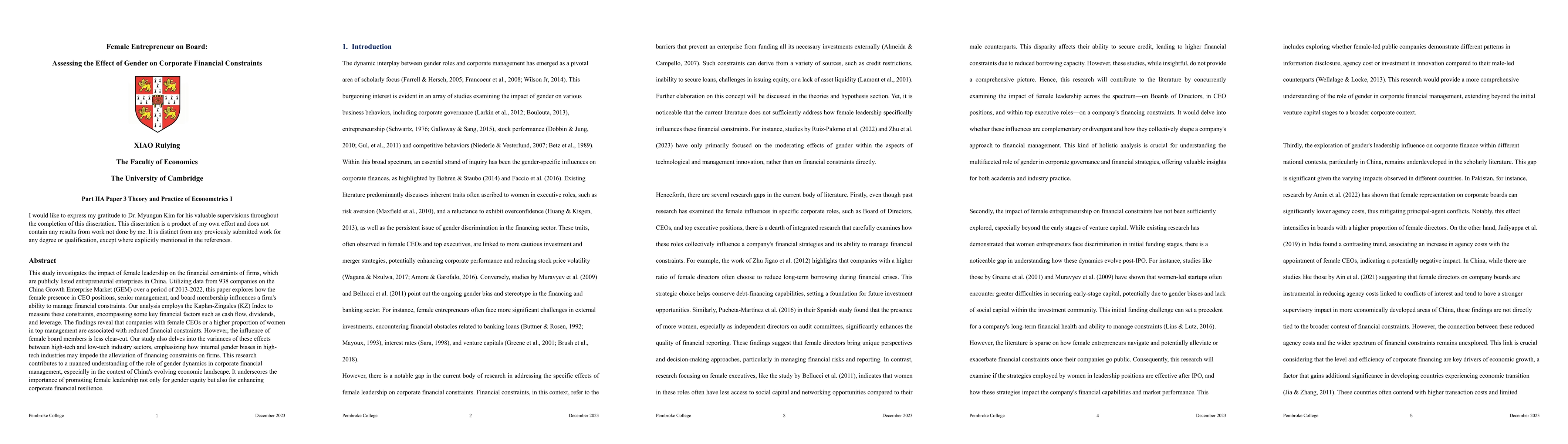 This study examines how female leadership in CEO positions and senior management affects financial constraints in Chinese entrepreneurial firms, finding that female CEOs and higher female representation in top management correlate with reduced financial constraints. The impact of female board members remains ambiguous, with internal gender biases in high-tech sectors hindering financial relief.