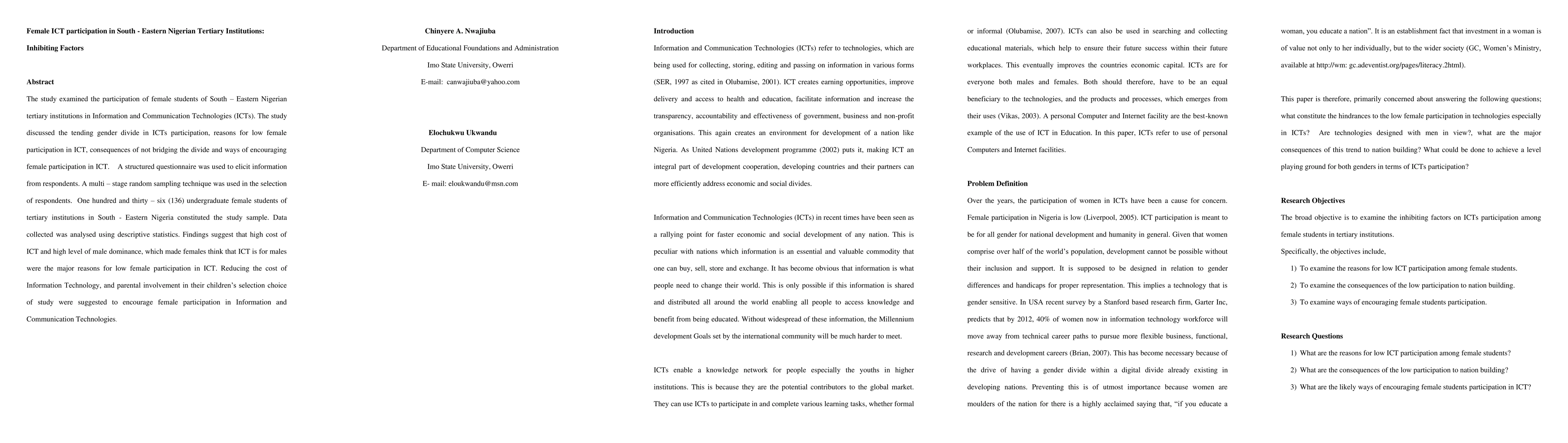 The study investigates the low female participation in ICTs in South Eastern Nigerian tertiary institutions, attributing it to high costs and male dominance. Recommendations to boost female participation include reducing ICT costs and parental involvement in study choices.