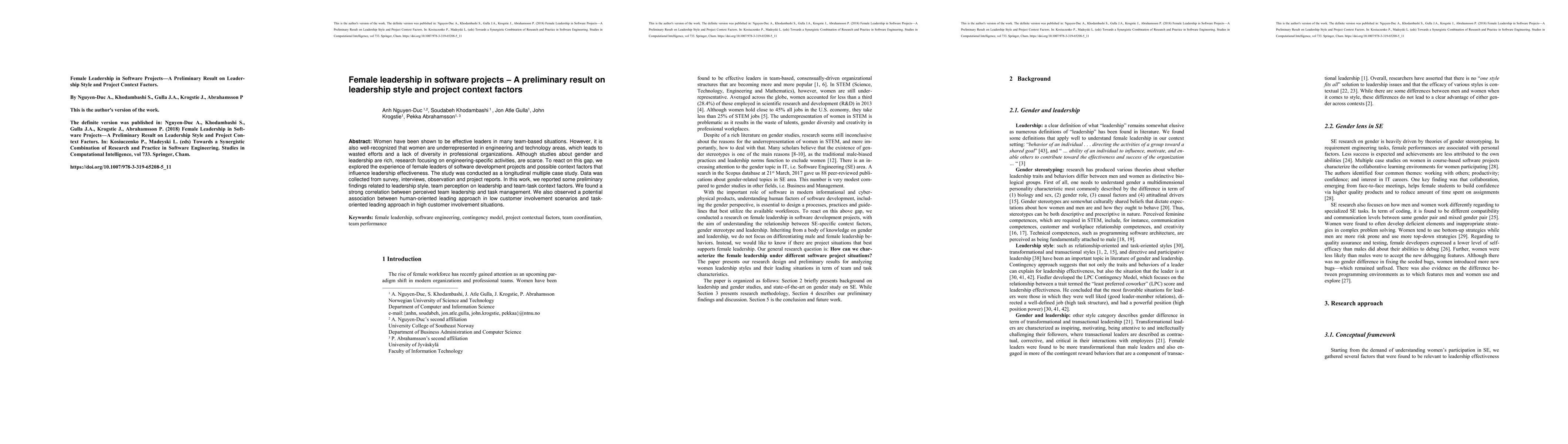 This study investigates female leadership in software development projects, revealing a strong correlation between perceived leadership effectiveness and task management. Preliminary findings suggest a human-oriented leadership style in low customer involvement scenarios and a task-oriented approach in high customer involvement situations.