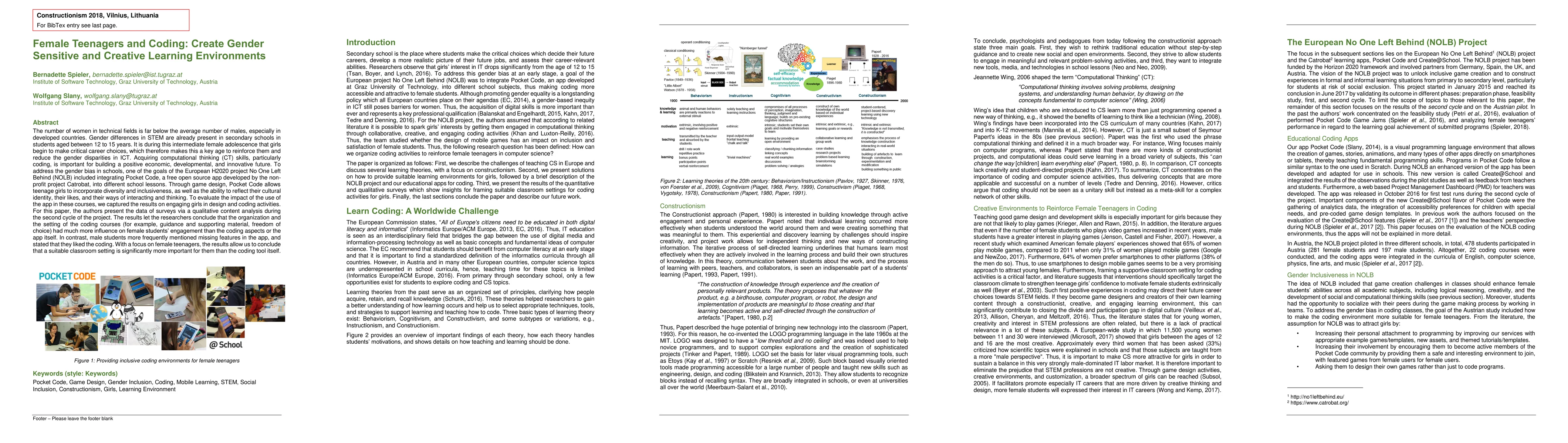 The number of women in technical fields is far below the average number of males, especially in developed countries. Gender differences in STEM are already present in secondary schools in students aged between 12 to 15 years. Adolescence is a critical time for identity formation, and self-attributes are a source for internal conflicts, especially for female teenagers. It is during this intermediate female adolescence that girls begin to make critical career choices, which therefore makes this a key age to reinforce them and reduce the gender disparities in ICT. Computational thinking skills are important from a philosophical point of view, since they allow us to understand the foundations of rational thought in a clear, easily understandable, but also inspiring and challenging way. To address the gender bias in schools, one of the goals of the European H2020 project No One Left Behind (NOLB) included integrating Pocket Code, a free open source app developed by the non-profit project Catrobat, into different school lessons. Through game design, Pocket Code allows teenage girls to incorporate diversity and inclusiveness, as well as the ability to reflect their cultural identity, their emotions, their likes, and their ways of interacting and thinking. To evaluate the impact of the use of the app in these courses, we captured the results on engaging girls in design and coding activities. For this paper, the authors present the data of surveys during the second cycle of the project. With a focus on female teenagers, the results allow us to conclude that a suitable classroom setting is significantly more important for them than the coding tool itself.
