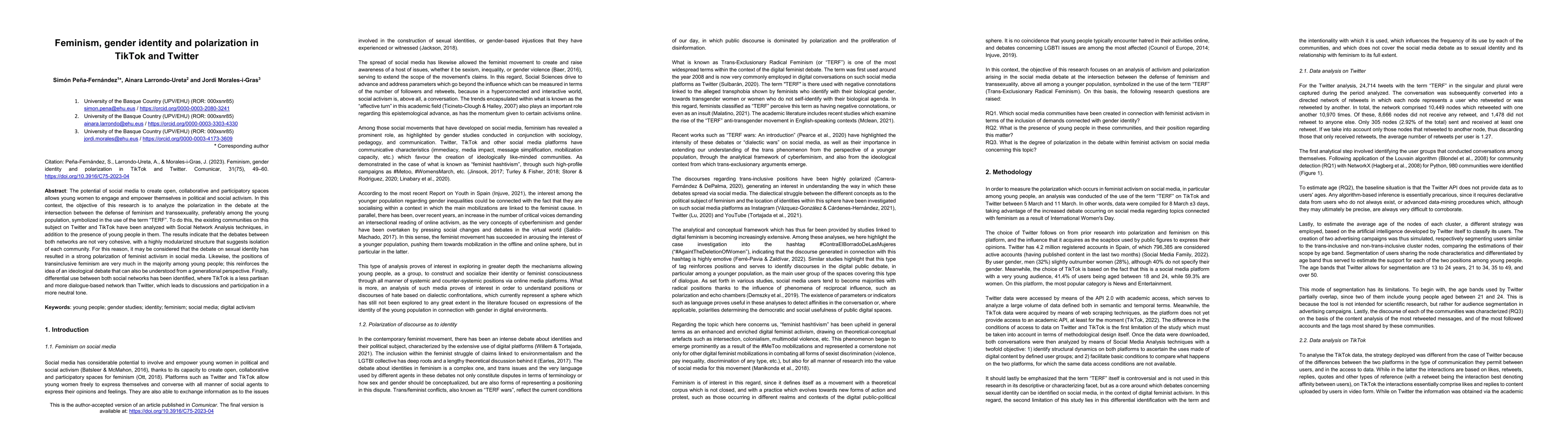 The potential of social media to create open, collaborative and participatory spaces allows young women to engage and empower themselves in political and social activism. In this context, the objective of this research is to analyze the polarization in the debate at the intersection between the defense of feminism and transsexuality, preferably among the young population, symbolized in the use of the term 'TERF'. To do this, the existing communities on this subject on Twitter and TikTok have been analyzed with Social Network Analysis techniques, in addition to the presence of young people in them. The results indicate that the debates between both networks are not very cohesive, with a highly modularized structure that suggests isolation of each community. For this reason, it may be considered that the debate on sexual identity has resulted in a strong polarization of feminist activism in social media. Likewise, the positions of transinclusive feminism are very much in the majority among young people; this reinforces the idea of an ideological debate that can also be understood from a generational perspective. Finally, differential use between both social networks has been identified, where TikTok is a less partisan and more dialogue-based network than Twitter, which leads to discussions and participation in a more neutral tone.