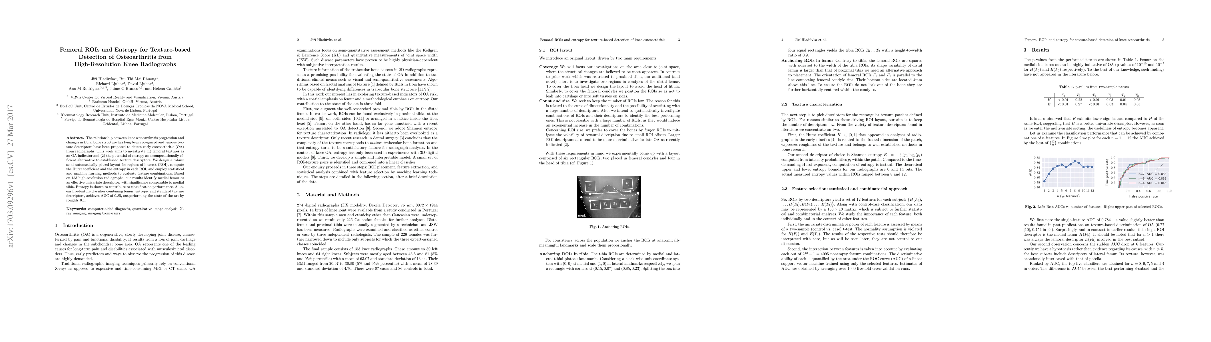 This research is important as it suggests that OA affects bone structure in the femur, in addition to well-known changes in the tibia, and proposes entropy as a computationally efficient texture descriptor for OA detection.