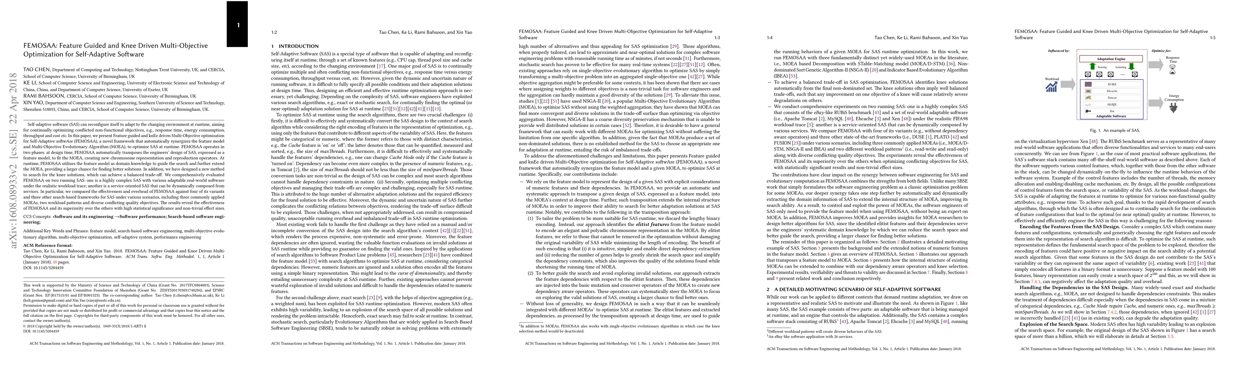 FEMOSAA is a novel framework that combines feature models and Multi-Objective Evolutionary Algorithms to optimize self-adaptive software at runtime. It effectively balances conflicting objectives and outperforms other search-based frameworks in various scenarios.