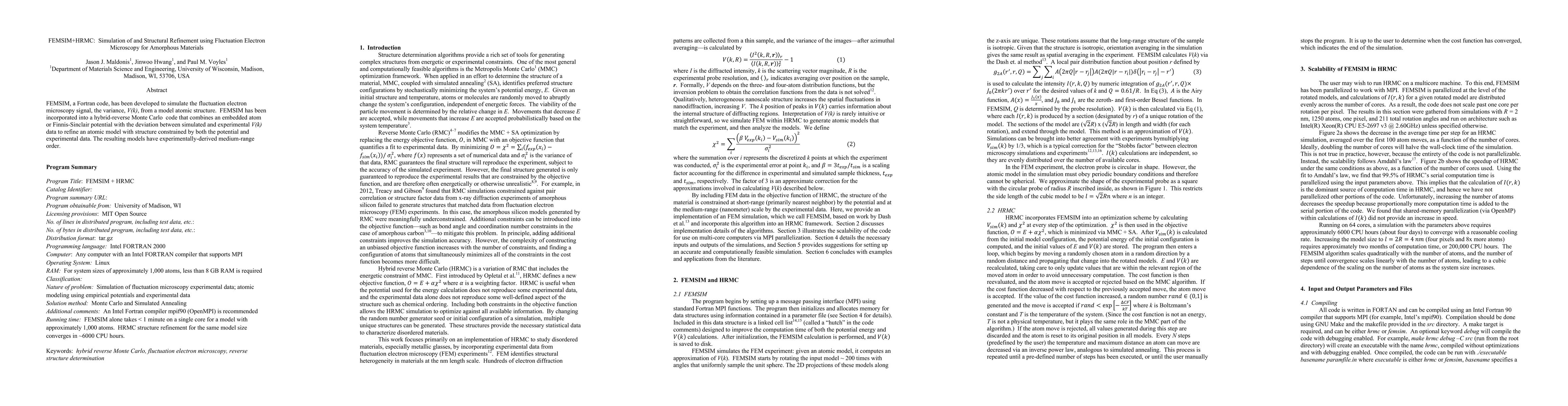 FEMSIM, a Fortran code, has been developed to simulate the fluctuation electron microscopy signal, the variance, V(k), from a model atomic structure. FEMSIM has been incorporated into a hybrid-reverse Monte Carlo code that combines an embedded atom or Finnis-Sinclair potential with the deviation between simulated and experimental V(k) data to refine an atomic model with structure constrained by both the potential and experimental data. The resulting models have experimentally-derived medium-range order.