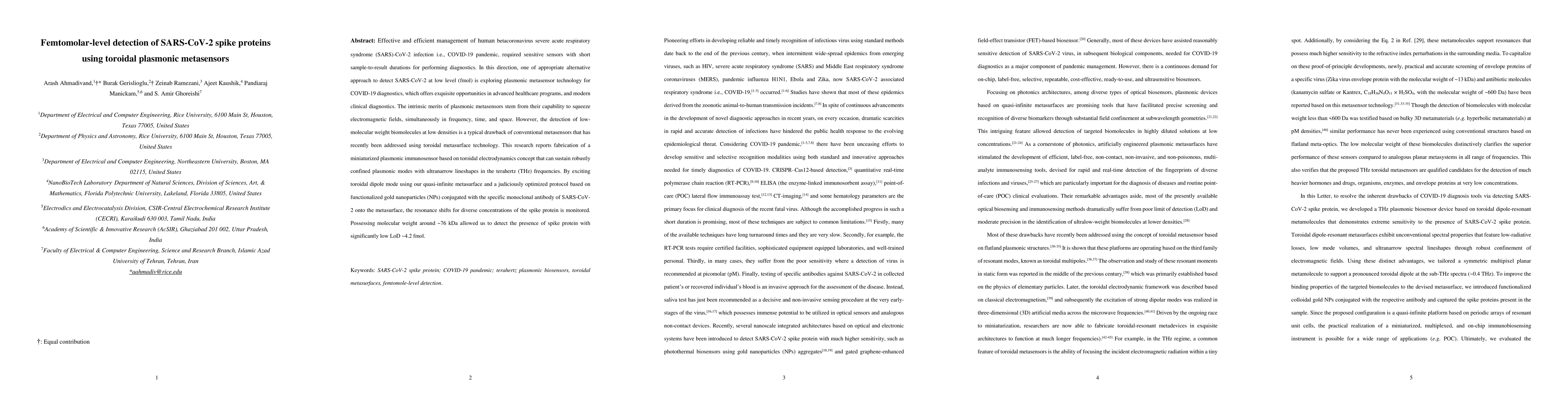 This research develops a femtomolar-level detection method for SARS-CoV-2 spike proteins using toroidal plasmonic metasensors, achieving a detection limit of ~4.2 fmol. The toroidal metasurface technology enhances sensitivity by confining plasmonic modes and monitoring resonance shifts via functionalized gold nanoparticles.