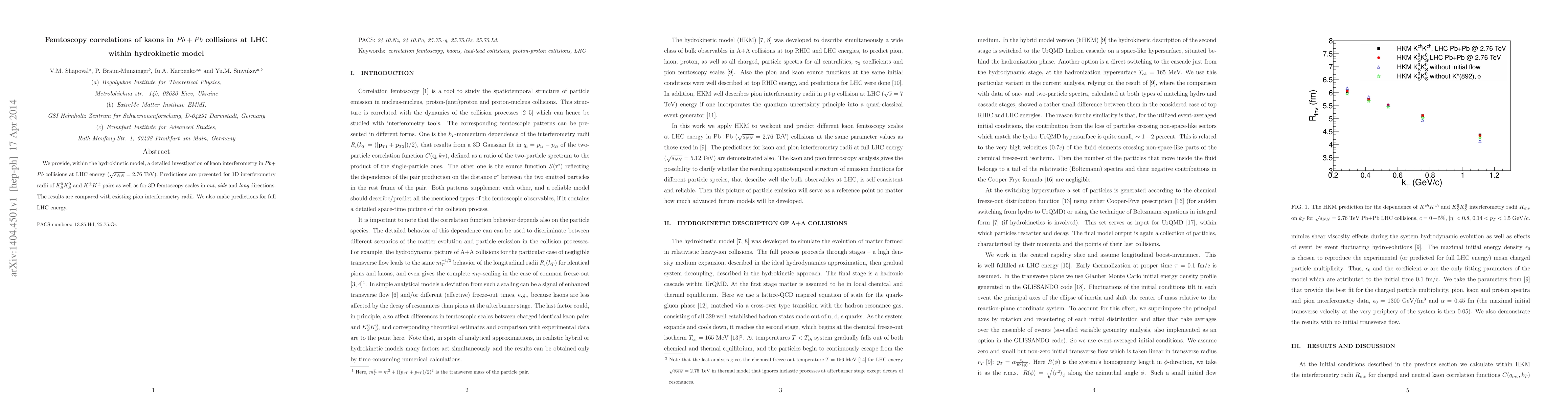 We provide, within the hydrokinetic model, a detailed investigation of kaon interferometry in $Pb+Pb$ collisions at LHC energy ($\sqrt{s_{NN}} = 2.76$ TeV). Predictions are presented for 1D interferometry radii of $K^0_SK^0_S$ and $K^{\pm}K^{\pm}$ pairs as well as for 3D femtoscopy scales in out, side and long directions. The results are compared with existing pion interferometry radii. We also make predictions for full LHC energy.