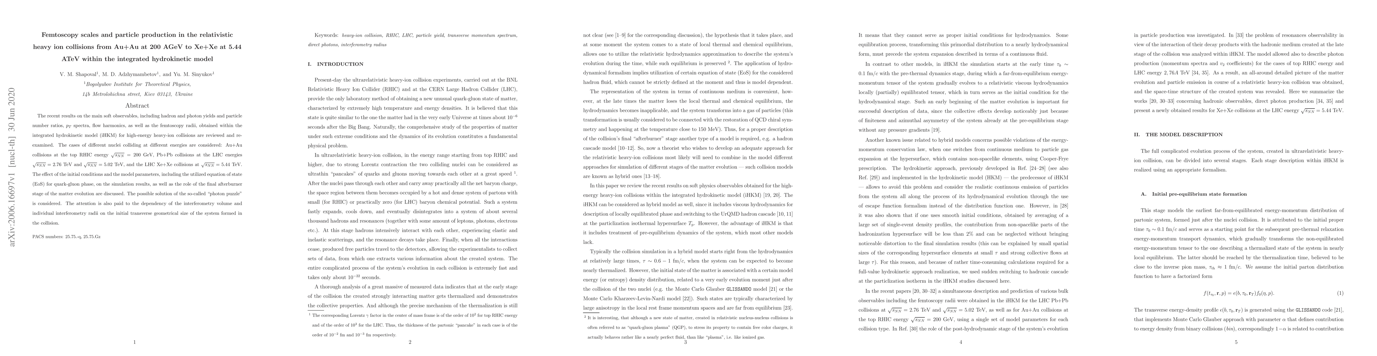 This paper reviews femtoscopy scales and particle production in relativistic heavy-ion collisions from Au+Au to Xe+Xe using the integrated hydrokinetic model (iHKM). It examines the influence of initial conditions and model parameters on the simulation results, including the resolution of the "photon puzzle" and the dependency of interferometry radii on the initial system size.