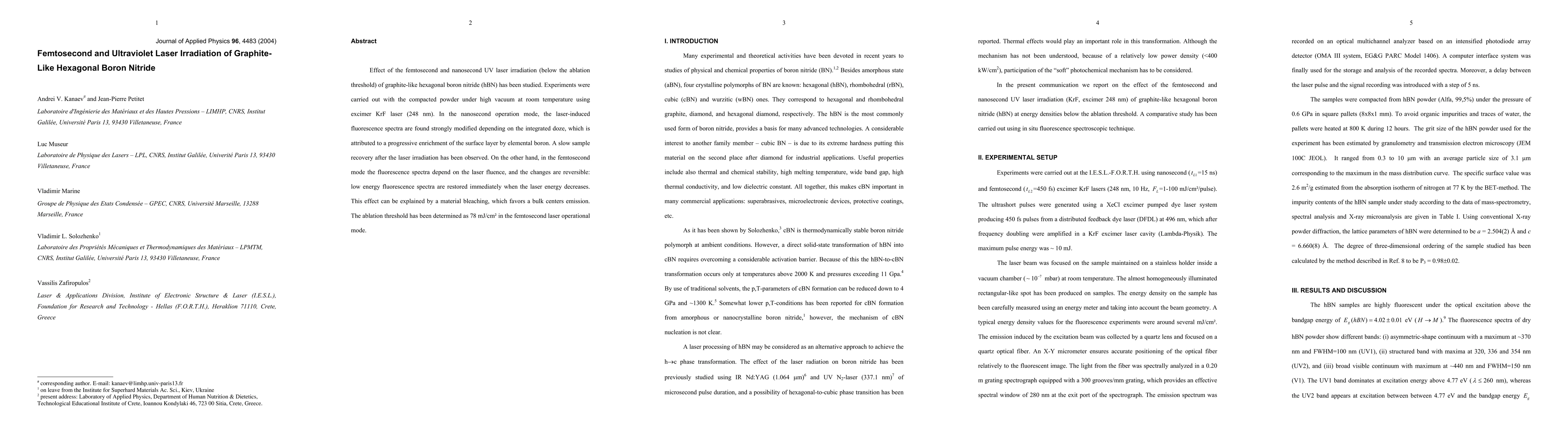 This study investigates the effects of femtosecond and nanosecond UV laser irradiation on graphite-like hexagonal boron nitride (hBN), finding that nanosecond irradiation progressively enriches the surface with elemental boron, while femtosecond irradiation causes reversible material bleaching that restores low-energy fluorescence spectra. The ablation threshold is identified at 78 mJ/cm² for femtosecond laser mode.