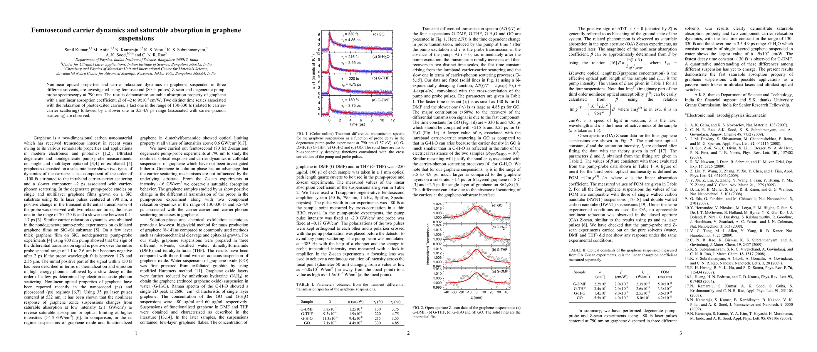 This study investigates the nonlinear optical properties and carrier dynamics in graphene suspensions via femtosecond Z-scan and pump-probe spectroscopy, revealing saturable absorption and two distinct relaxation time scales: a fast phase (130-330 fs) and a slower phase (3.5-4.9 ps).