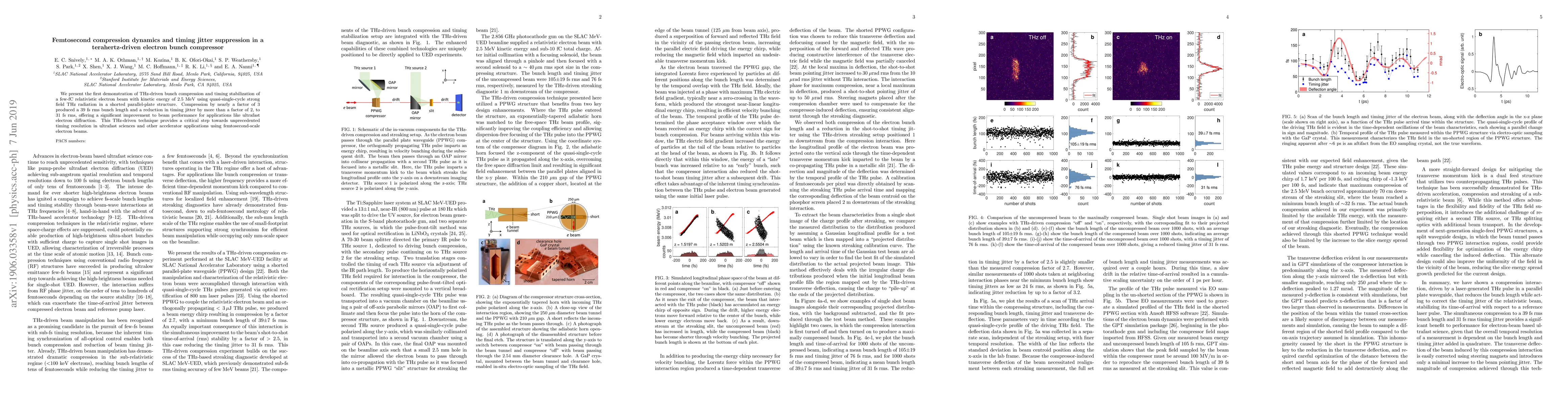 This paper demonstrates the first use of terahertz radiation to compress and stabilize a relativistic electron beam, achieving a nearly three-fold compression and reducing timing jitter by more than half, significantly enhancing beam performance for ultrafast electron diffraction and other applications.