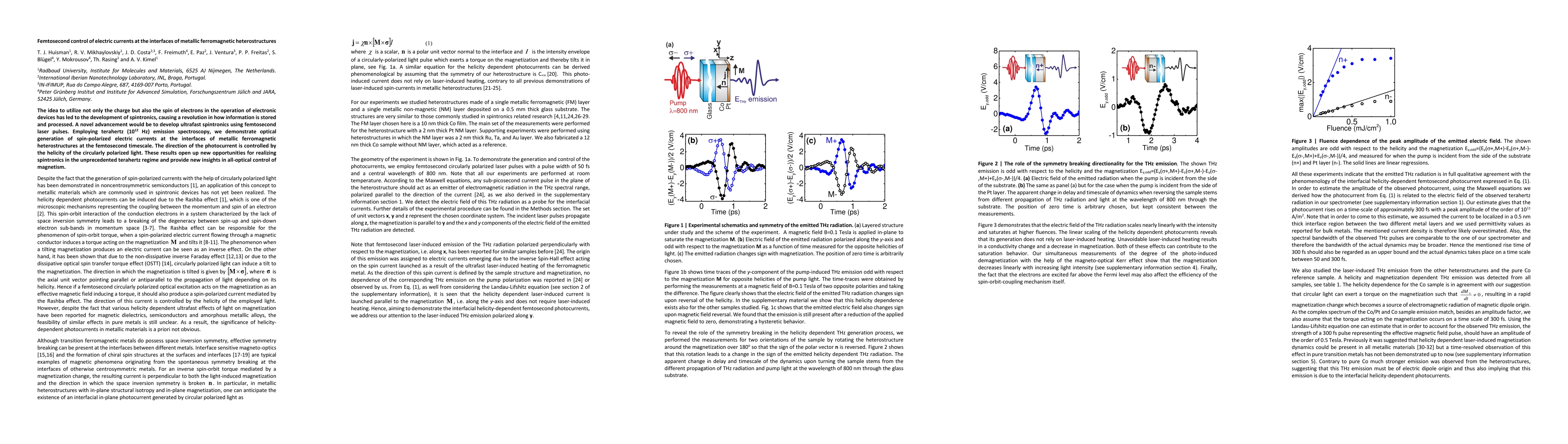 This paper demonstrates the use of femtosecond laser pulses to generate spin-polarized electric currents at the interfaces of metallic ferromagnetic heterostructures, controlled by the helicity of the circularly polarized light, thus advancing the field of ultrafast spintronics and providing new insights into all-optical control of magnetism.