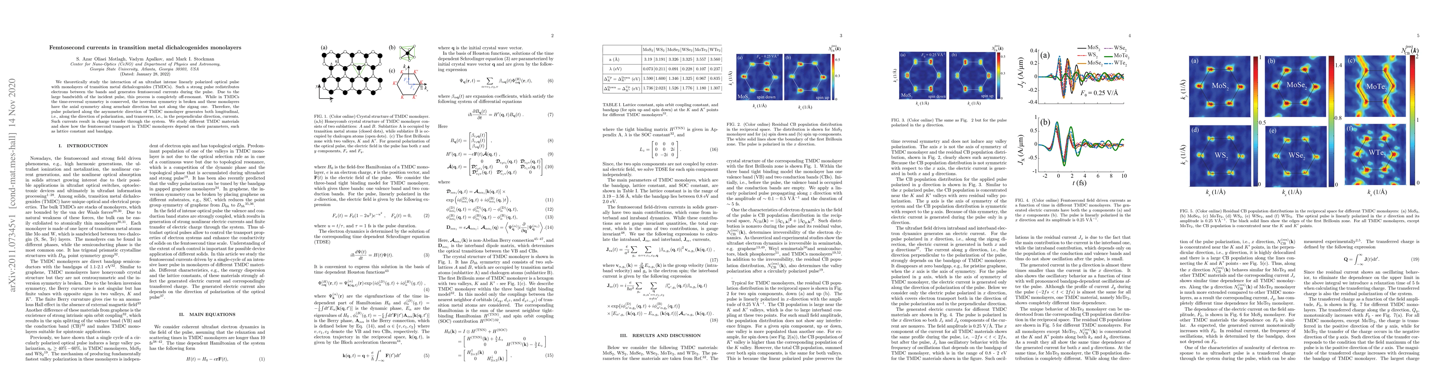 This paper theoretically investigates how ultrafast intense optical pulses interact with transition metal dichalcogenides monolayers, generating femtosecond currents off-resonantly. The study reveals that polarized pulses along the asymmetric direction induce both longitudinal and transverse currents, dependent on material parameters like lattice constant and bandgap.