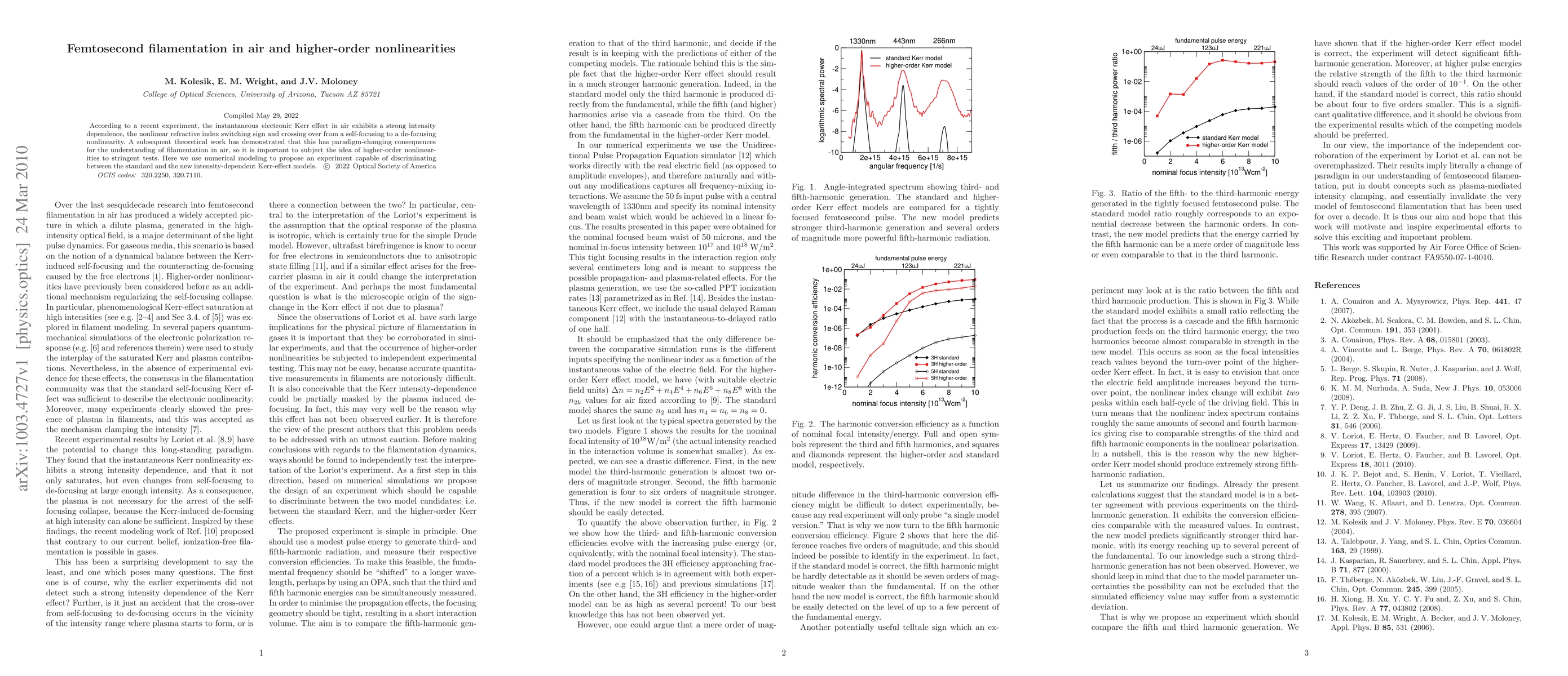 This research investigates the intensity-dependent Kerr effect in air, revealing a nonlinear refractive index that switches from self-focusing to de-focusing. It proposes a numerical experiment to differentiate between traditional and new models of filamentation in air, emphasizing the significance of higher-order nonlinearities.
