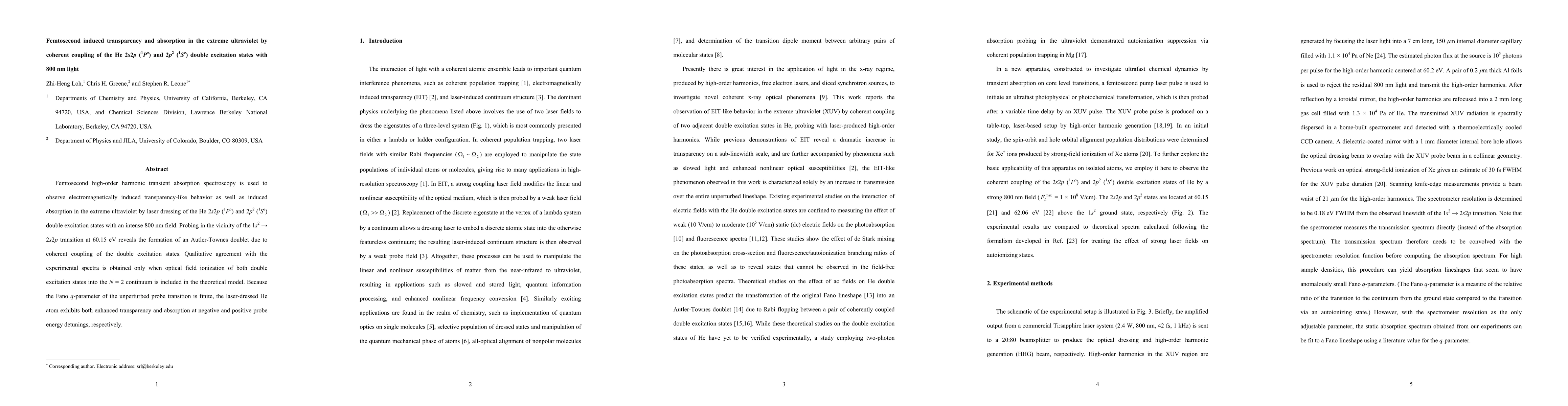 This paper investigates femtosecond high-order harmonic transient absorption spectroscopy to observe electromagnetically induced transparency and induced absorption in the extreme ultraviolet by laser dressing of He's double excitation states. The study reveals an Autler-Townes doublet formation due to coherent coupling, with theoretical models requiring optical field ionization for qualitative agreement.