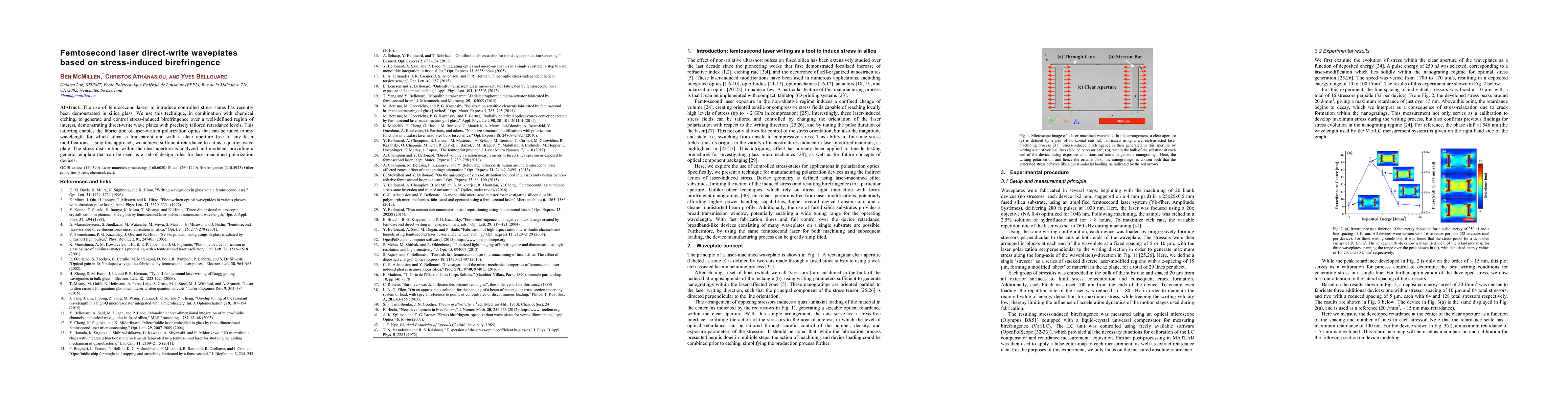 Summary: Researchers utilize femtosecond lasers to create stress-induced birefringence in silica glass, combined with chemical etching, to fabricate precise direct-write wave plates. This method allows for the production of tunable polarization optics without modifying the clear aperture, achieving sufficient retardance for quarter-wave plates, and provides a modeling framework for designing laser-machined polarization devices.
