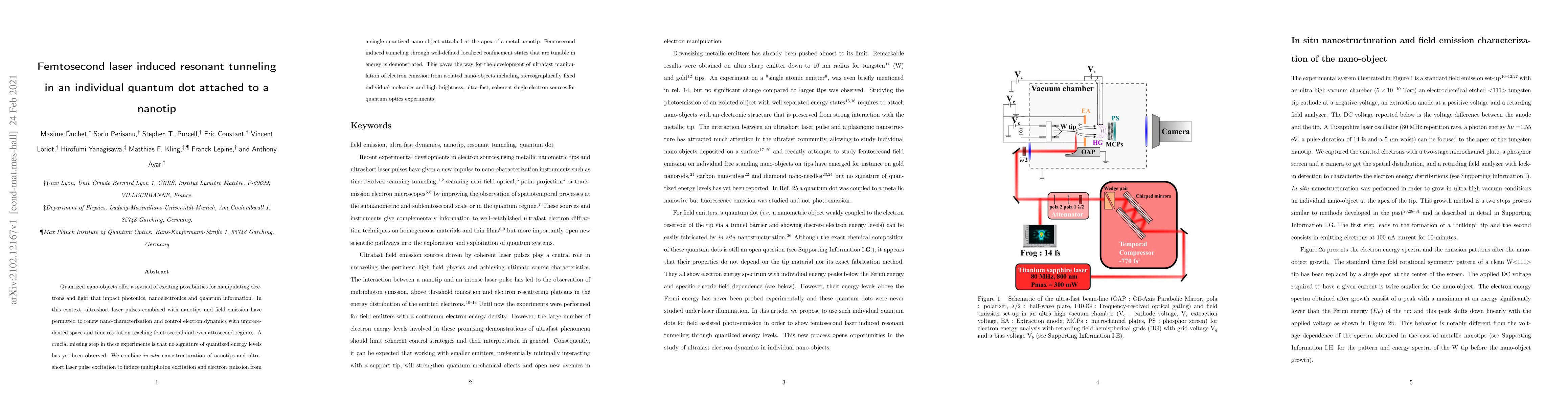 Quantized nano-objects offer a myriad of exciting possibilities for manipulating electrons and light that impact photonics, nanoelectronics, and quantum information. In this context, ultrashort laser pulses combined with nanotips and field emission have permitted renewing nano-characterization and control electron dynamics with unprecedented space and time resolution reaching femtosecond and even attosecond regimes. A crucial missing step in these experiments is that no signature of quantized energy levels has yet been observed. We combine in situ nanostructuration of nanotips and ultrashort laser pulse excitation to induce multiphoton excitation and electron emission from a single quantized nano-object attached at the apex of a metal nanotip. Femtosecond induced tunneling through well-defined localized confinement states that are tunable in energy is demonstrated. This paves the way for the development of ultrafast manipulation of electron emission from isolated nano-objects including stereographically fixed individual molecules and high brightness, ultrafast, coherent single electron sources for quantum optics experiments.