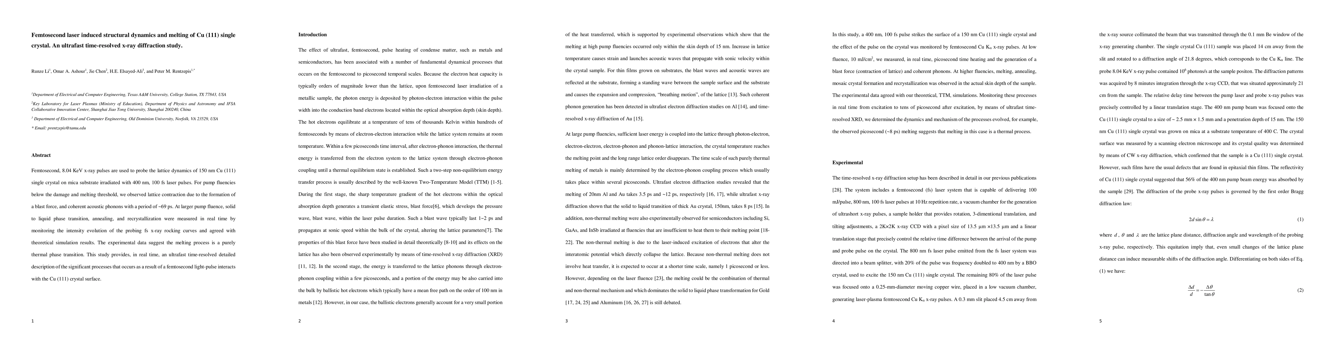 This study uses femtosecond x-ray pulses to observe the lattice dynamics and melting of Cu (111) single crystals under femtosecond laser pulses. It reveals a thermal phase transition and real-time processes including lattice contraction, coherent phonons, and recrystallization.