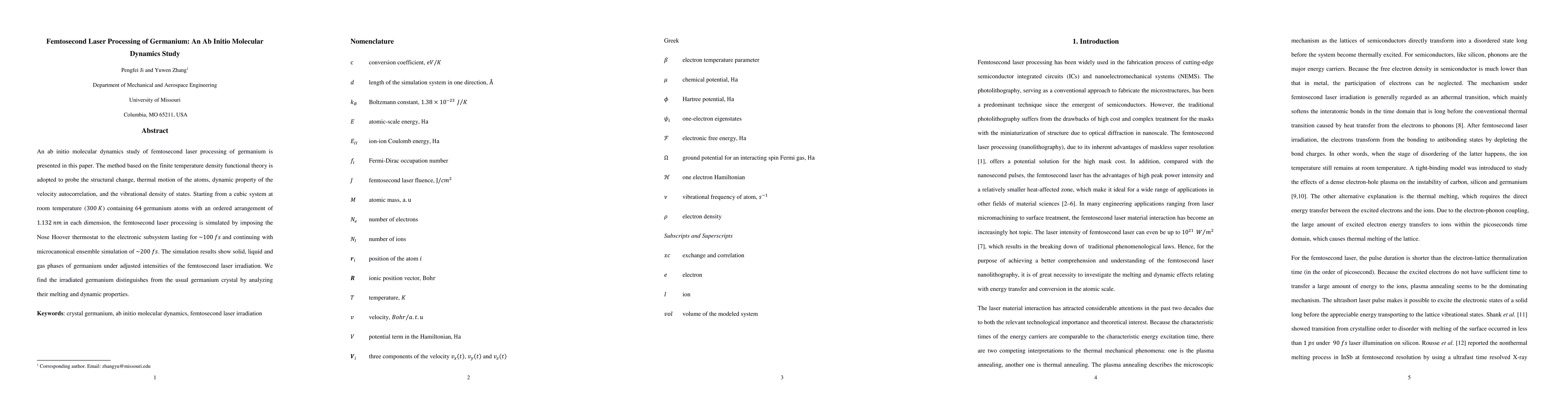 This paper uses ab initio molecular dynamics to study the effects of femtosecond laser processing on germanium, revealing structural changes and distinct melting and dynamic properties compared to conventional germanium crystals. The simulation shows transitions between solid, liquid, and gas phases under varying laser intensities.