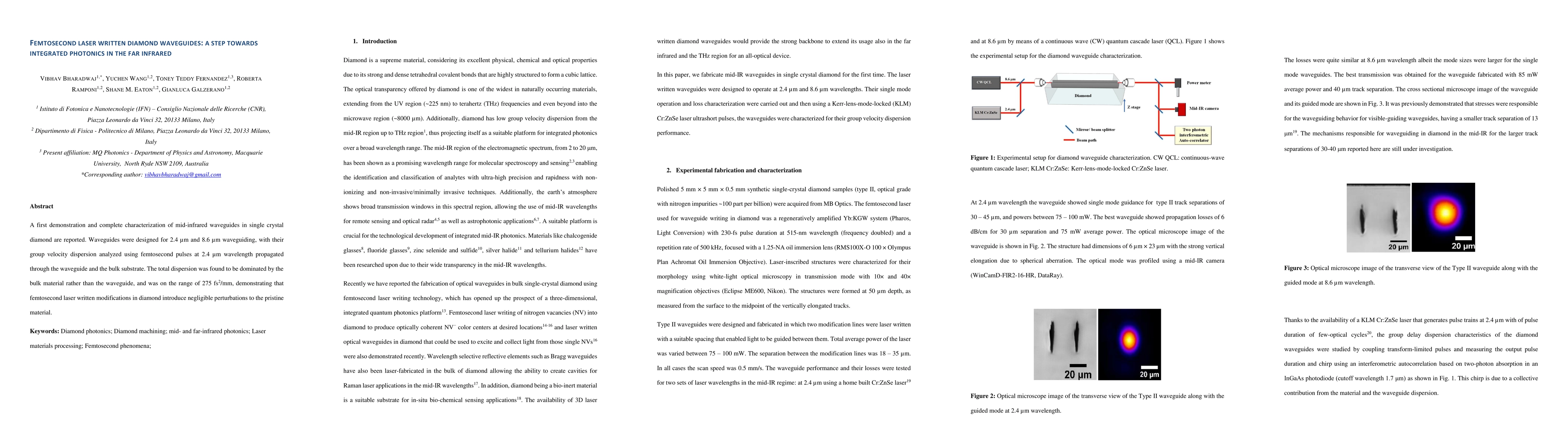 This paper demonstrates the fabrication and characterization of mid-infrared waveguides in diamond using femtosecond laser writing, showing minimal dispersion perturbations and promising the potential for integrated photonics applications in the far infrared.