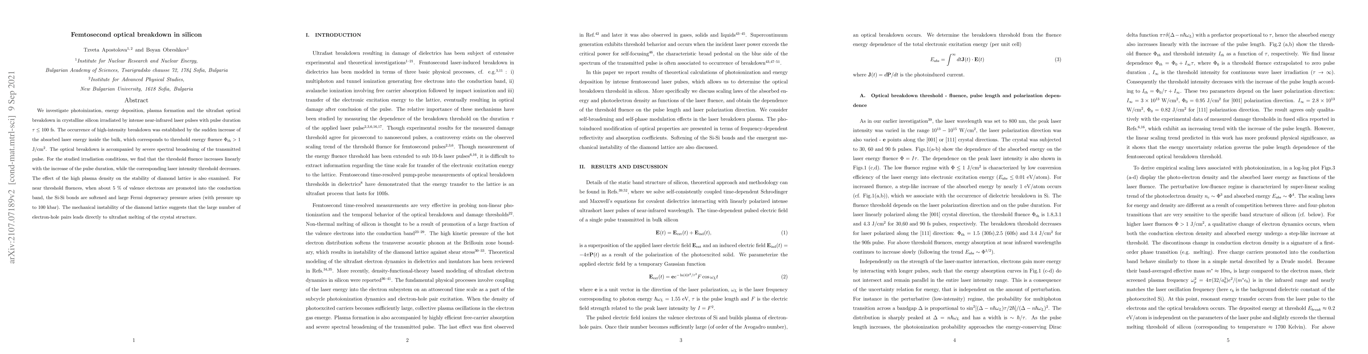 We investigate photoinization, energy deposition, plasma formation and the ultrafast optical breakdown in crystalline silicon irradiated by intense near-infrared laser pulses with pulse duration $\tau \le $ 100 fs. The occurrence of high-intensity breakdown was established by the sudden increase of the absorbed laser energy inside the bulk, which corresponds to threshold energy fluence $\Phi_{th} > $ 1 J/cm$^2$. The optical breakdown is accompanied by severe spectral broadening of the transmitted pulse. For the studied irradiation conditions, we find that the threshold fluence increases linearly with the increase of the pulse duration, while the corresponding laser intensity threshold decreases. The effect of the high plasma density on the stability of diamond lattice is also examined. For near threshold fluences, when about 5 \% of valence electrons are promoted into the conduction band, the Si-Si bonds are softened and large Fermi degeneracy pressure arises (with pressure up to 100 kbar). The mechanical instability of the diamond lattice suggests that the large number of electron-hole pairs leads directly to ultrafast melting of the crystal structure.