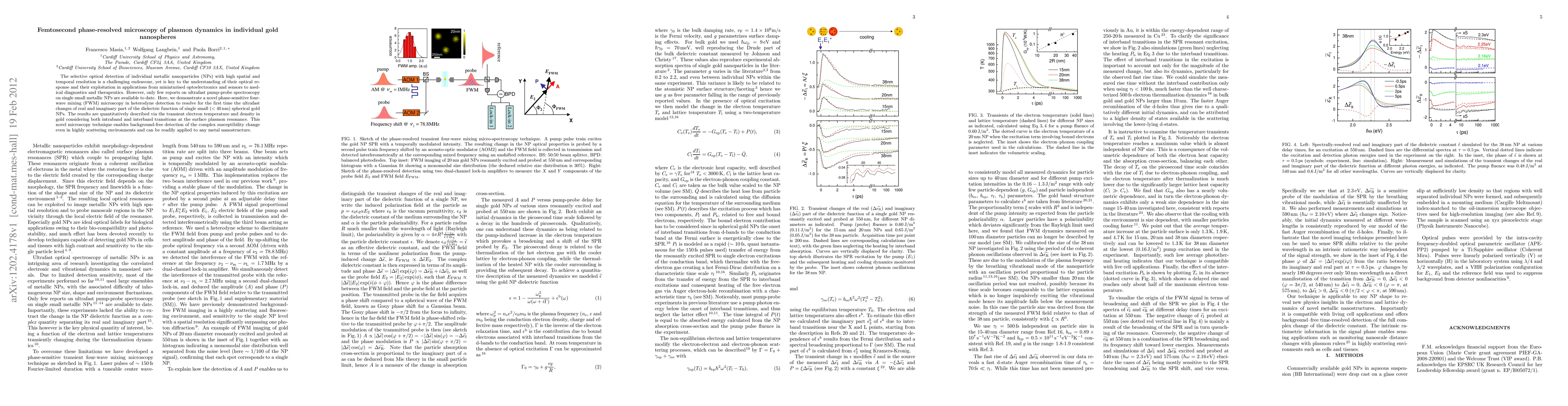 This paper introduces a novel phase-sensitive four-wave mixing microscopy technique for ultrafast detection of plasmon dynamics in individual gold nanospheres, resolving both real and imaginary parts of the dielectric function. This method provides background-free, high-resolution optical response analysis, crucial for applications in optoelectronics, sensors, and medical diagnostics.