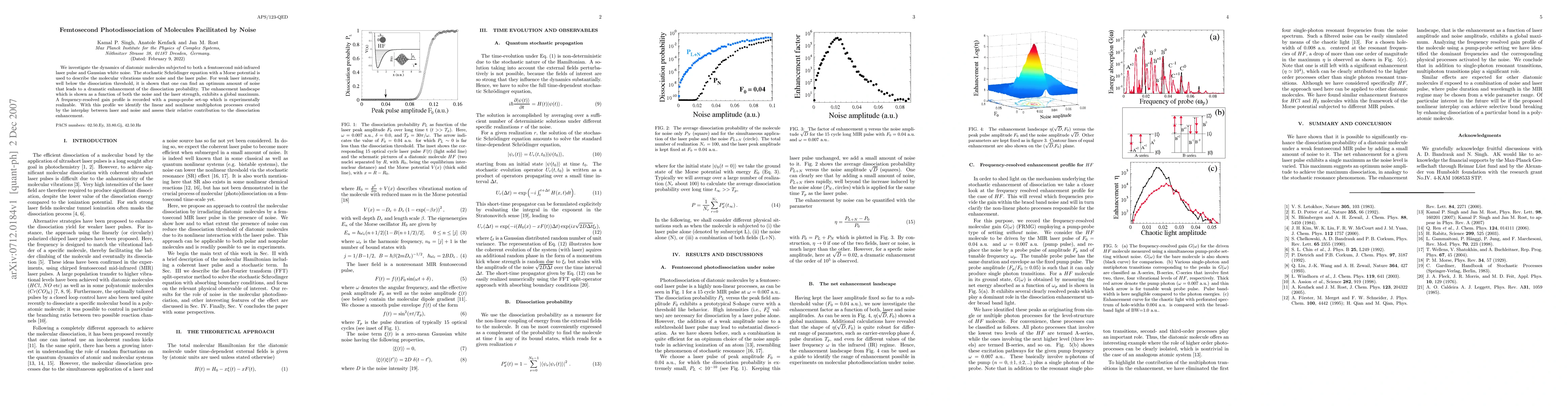We investigate the dynamics of diatomic molecules subjected to both a femtosecond mid-infrared laser pulse and Gaussian white noise. The stochastic Schr\"odinger equation with a Morse potential is used to describe the molecular vibrations under noise and the laser pulse. For weak laser intensity, well below the dissociation threshold, it is shown that one can find an optimum amount of noise that leads to a dramatic enhancement of the dissociation probability. The enhancement landscape which is shown as a function of both the noise and the laser strength, exhibits a global maximum. A frequency-resolved gain profile is recorded with a pump-probe set-up which is experimentally realizable. With this profile we identify the linear and nonlinear multiphoton processes created by the interplay between laser and noise and assess their relative contribution to the dissociation enhancement.