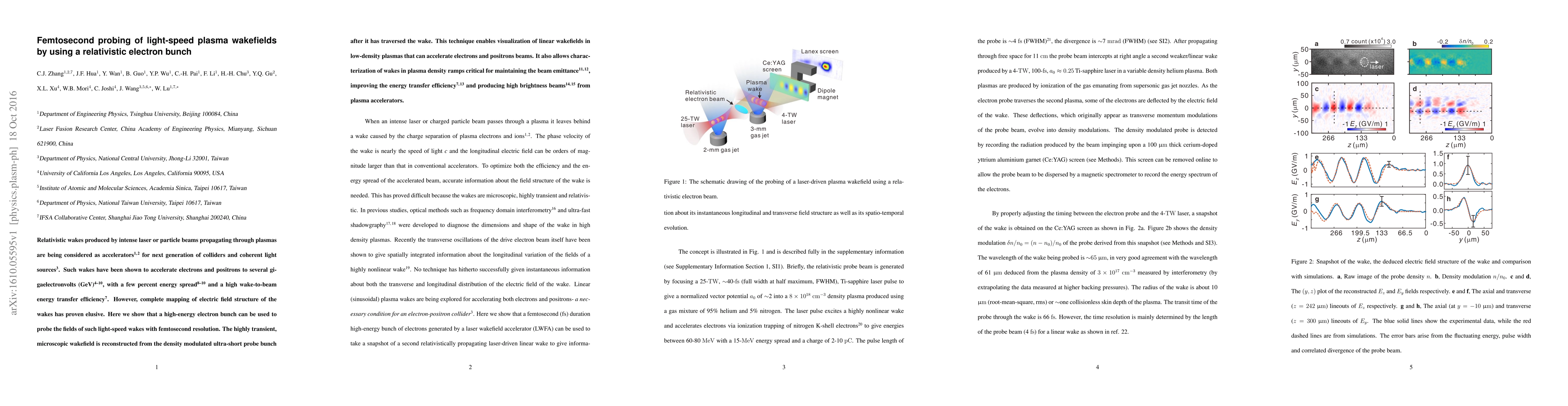This paper demonstrates the use of a relativistic electron bunch to probe and visualize femtosecond-resolution electric fields in light-speed plasma wakefields generated by intense laser or particle beams. This technique facilitates the mapping of linear wakefields and characterization of plasma density ramps, enhancing the efficiency and performance of next-generation plasma accelerators.