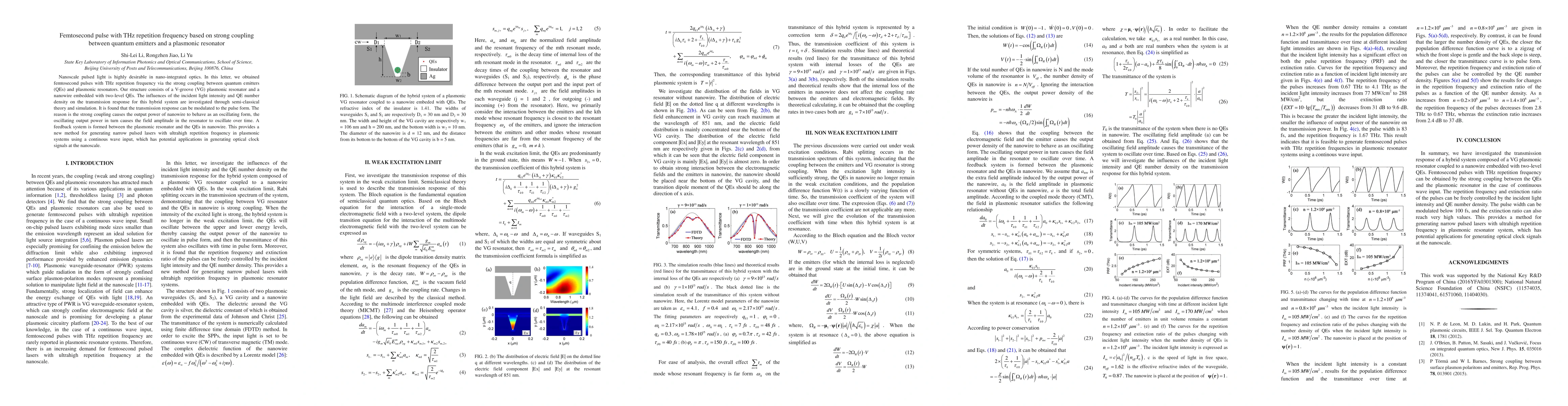 This paper reports the generation of femtosecond pulses with THz repetition frequency through strong coupling between quantum emitters and a plasmonic resonator in a V-groove structure. The study demonstrates that the interaction leads to an oscillating output power, forming a feedback loop that modulates the transmission response into pulse form.