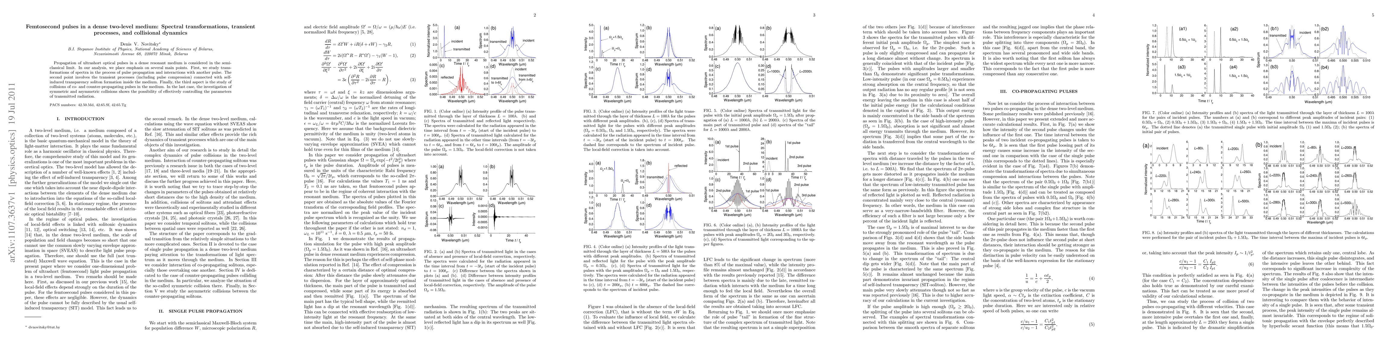 This paper explores the propagation of femtosecond pulses in dense two-level media, focusing on spectral transformations, transient processes like pulse compression, and soliton formation. It also investigates the dynamics of pulse collisions, revealing methods to control transmitted radiation parameters through symmetric and asymmetric interactions.