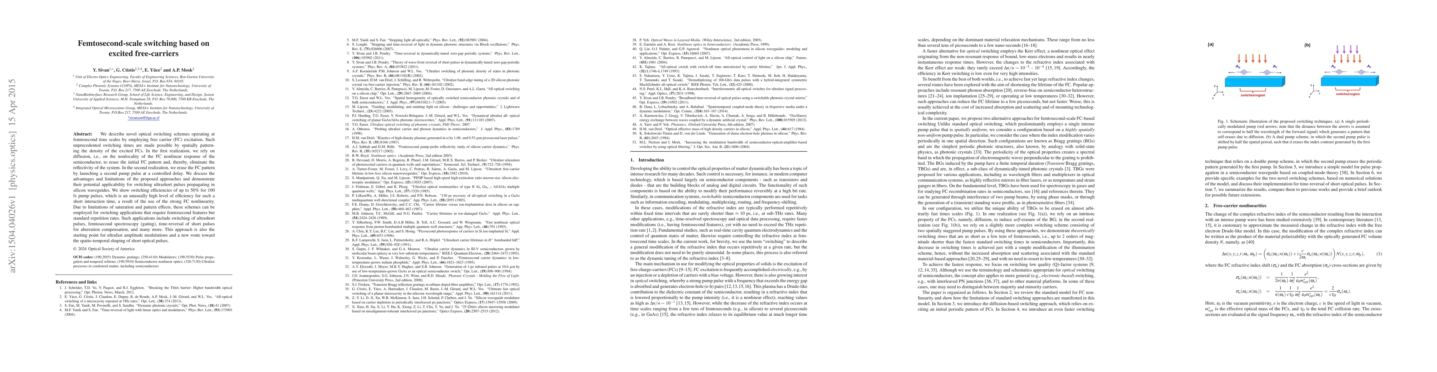 This paper presents novel femtosecond-scale optical switching techniques based on excited free carriers in semiconductors, achieving unprecedented switching speeds through spatial patterning of free carrier density. The proposed methods utilize either diffusion or a second pump pulse to erase the initial free carrier pattern, demonstrating high efficiency and potential for applications in ultrashort pulse switching and femtosecond spectroscopy.